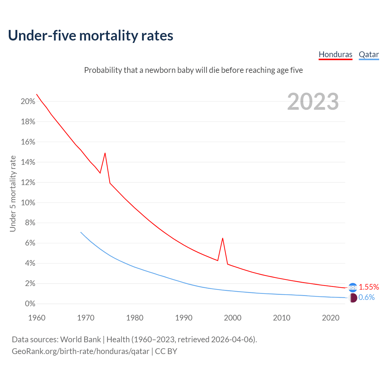 The chance that a newborn baby will die before reaching age five is 1.55% in Honduras and 0.6% in Qatar. Above is a chart with historical data on under-five mortality rates.