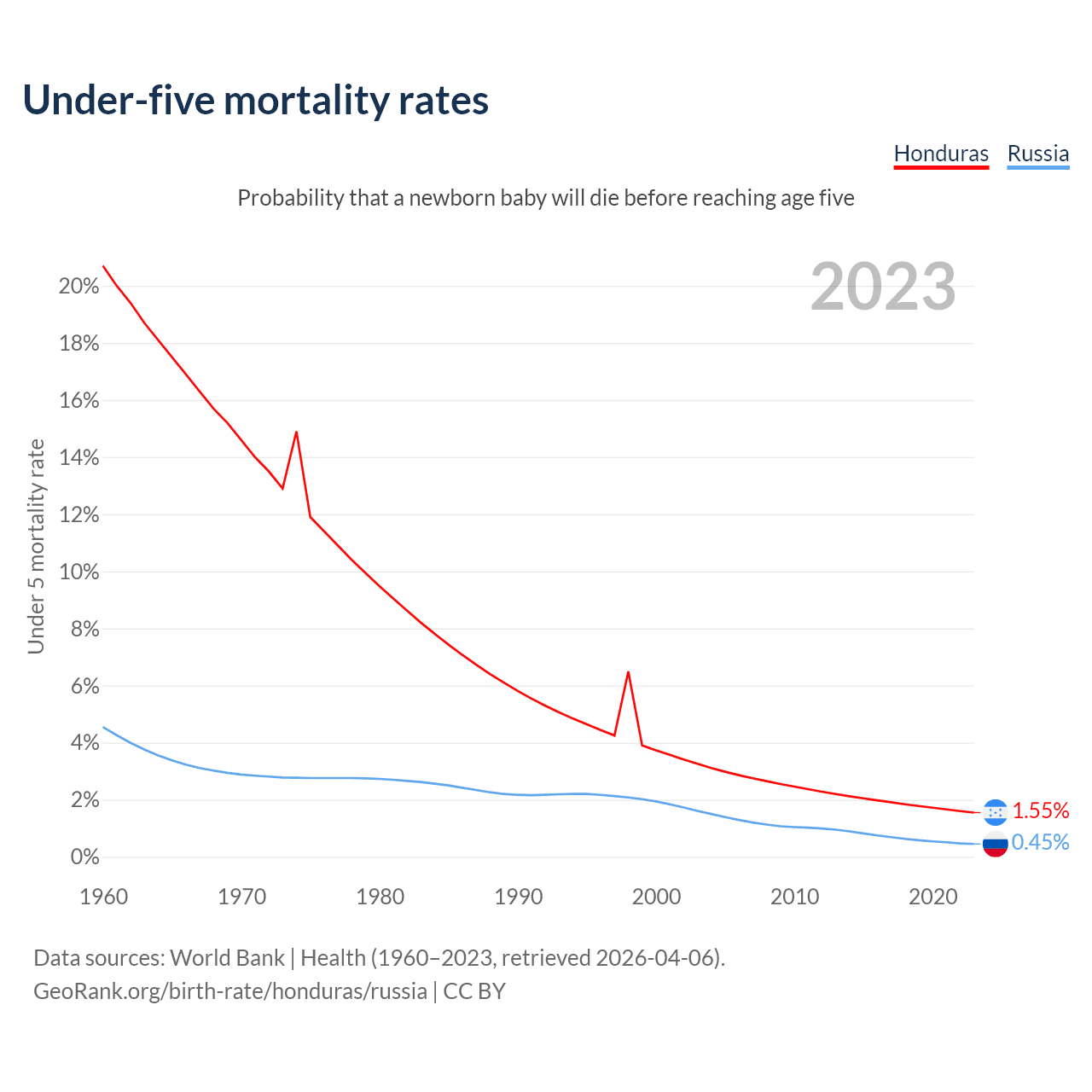 The chance that a newborn baby will die before reaching age five is 1.55% in Honduras and 0.45% in Russia. Above is a chart with historical data on under-five mortality rates.