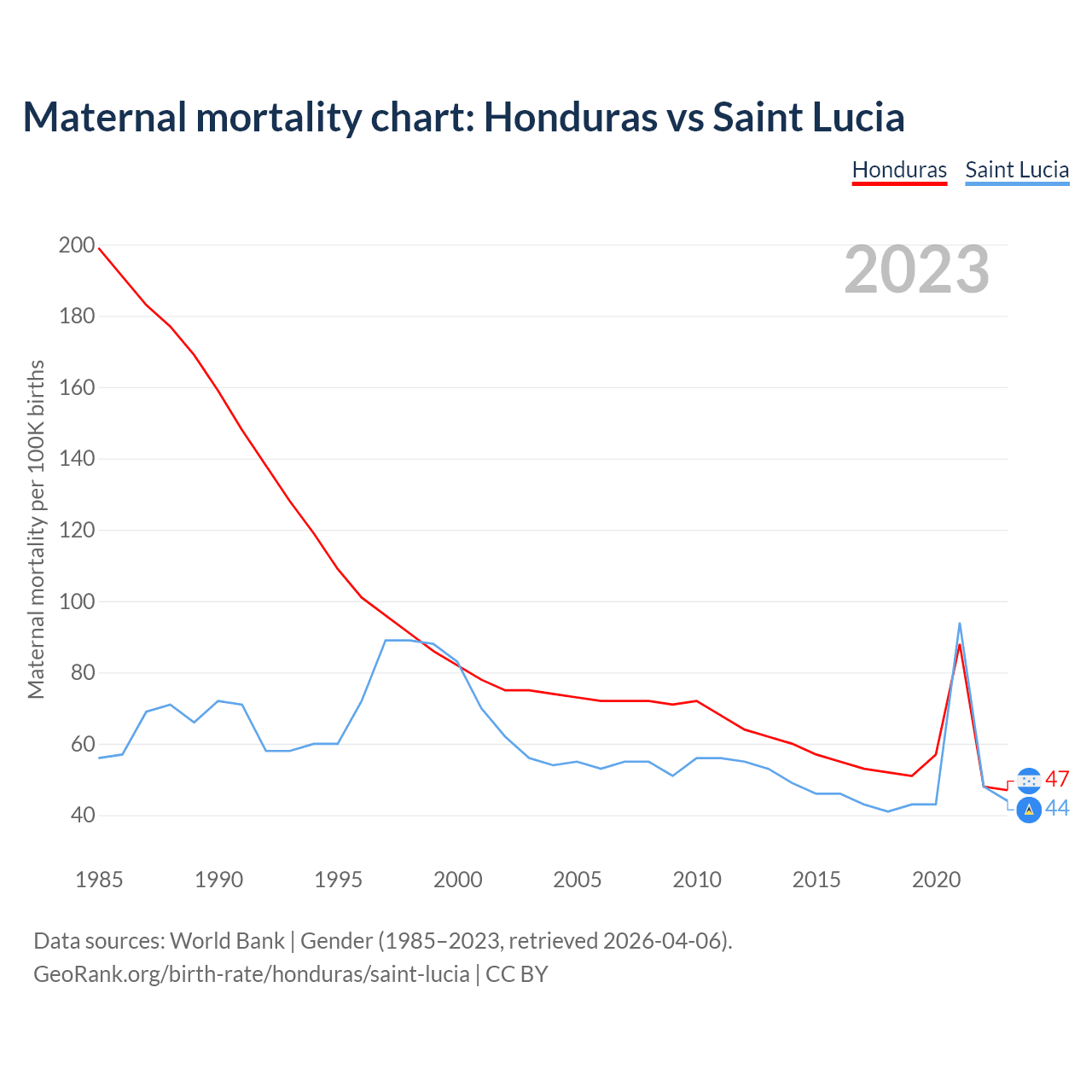 The maternal mortality rate, which is the probability of dying during childbirth or within 42 days of pregnancy termination, is 47 deaths per 100,000 live births in Honduras, compared to 44 deaths in Saint Lucia.