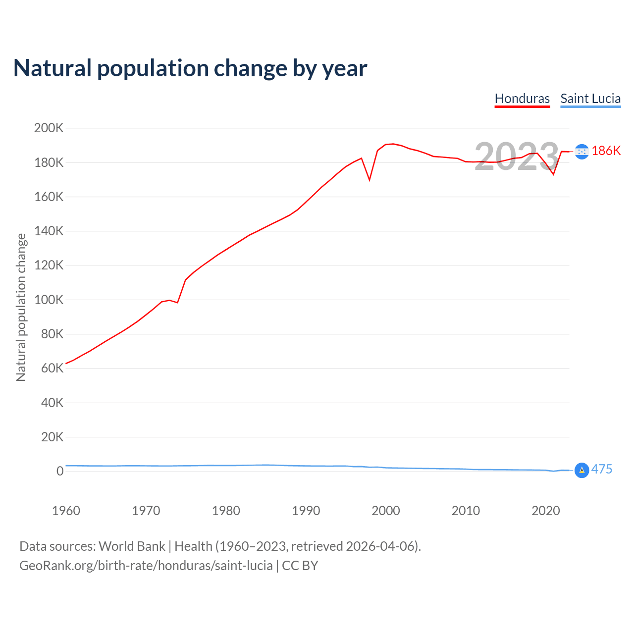 Honduras has an annual birth rate of 22 births per 1,000 people, compared to 11.3 for Saint Lucia. The average number of children a woman is expected to have during her lifetime — the fertility rate, is 2.5 in Honduras and 1.38 in Saint Lucia — 44.8% difference.