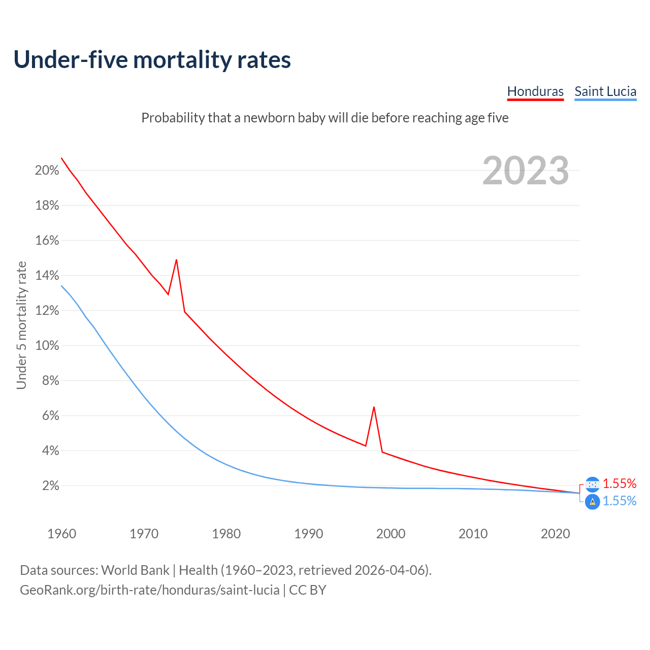 The chance that a newborn baby will die before reaching age five is 1.55% in Honduras and 1.55% in Saint Lucia. Above is a chart with historical data on under-five mortality rates.
