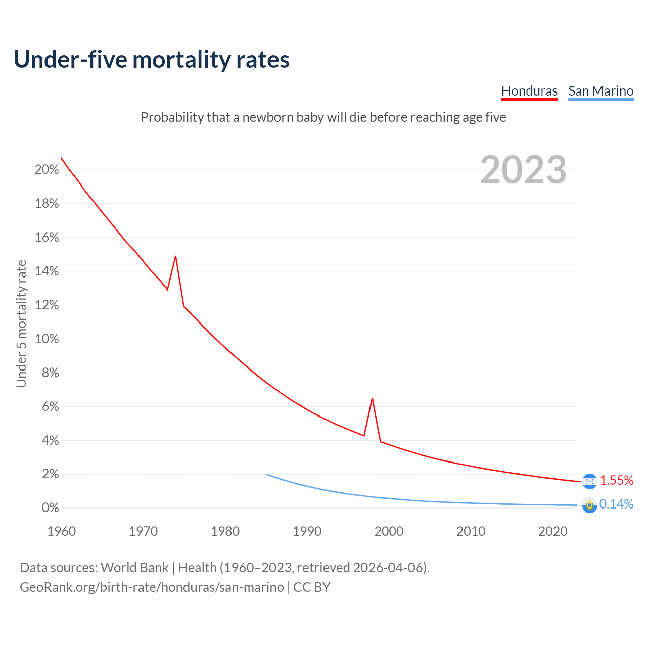 The chance that a newborn baby will die before reaching age five is 1.55% in Honduras and 0.14% in San Marino. Above is a chart with historical data on under-five mortality rates.