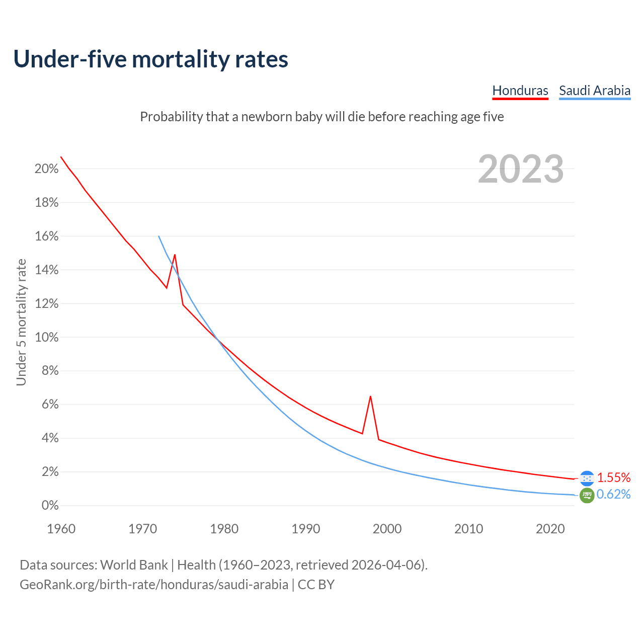 The chance that a newborn baby will die before reaching age five is 1.55% in Honduras and 0.62% in Saudi Arabia. Above is a chart with historical data on under-five mortality rates.