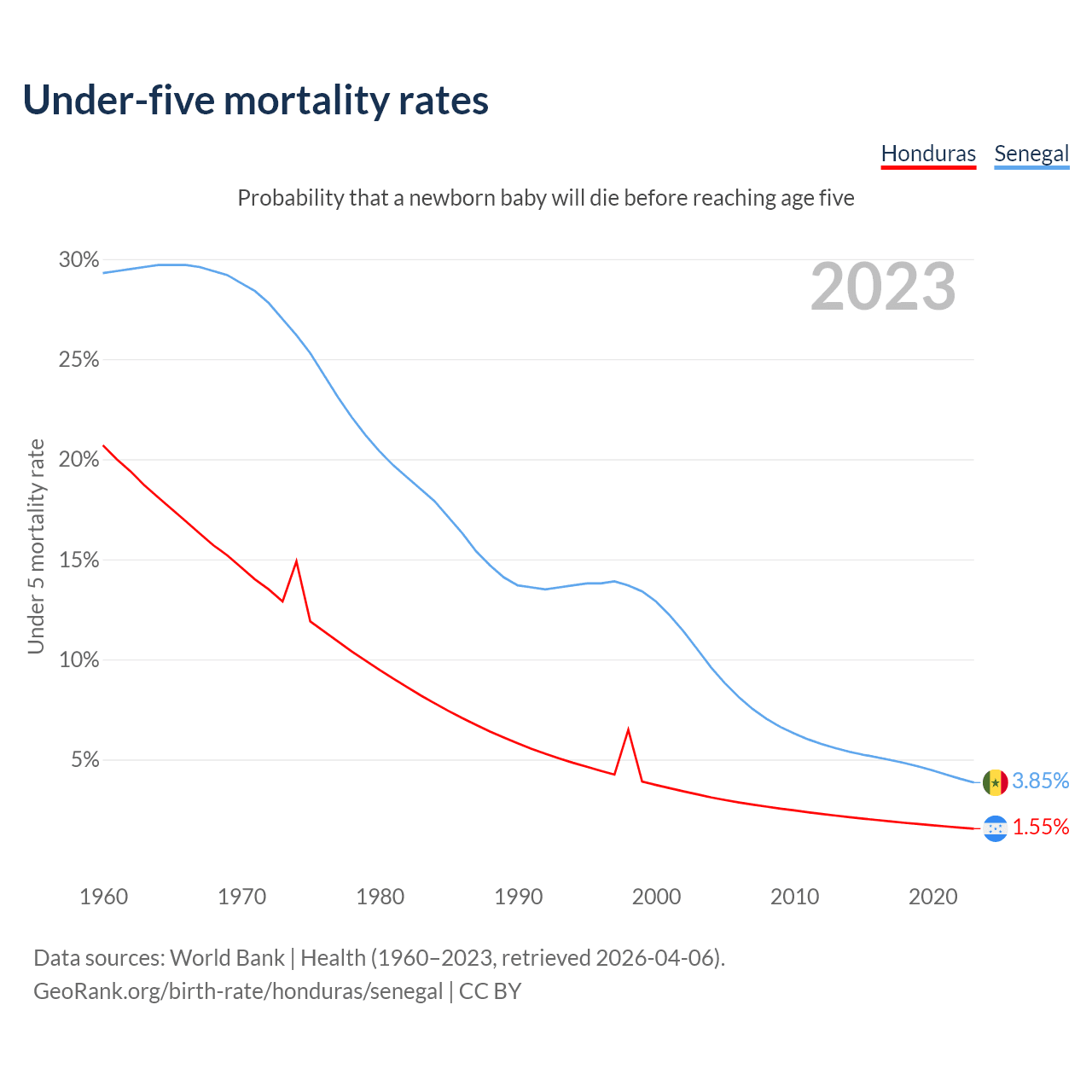 The chance that a newborn baby will die before reaching age five is 1.55% in Honduras and 3.85% in Senegal. Above is a chart with historical data on under-five mortality rates.