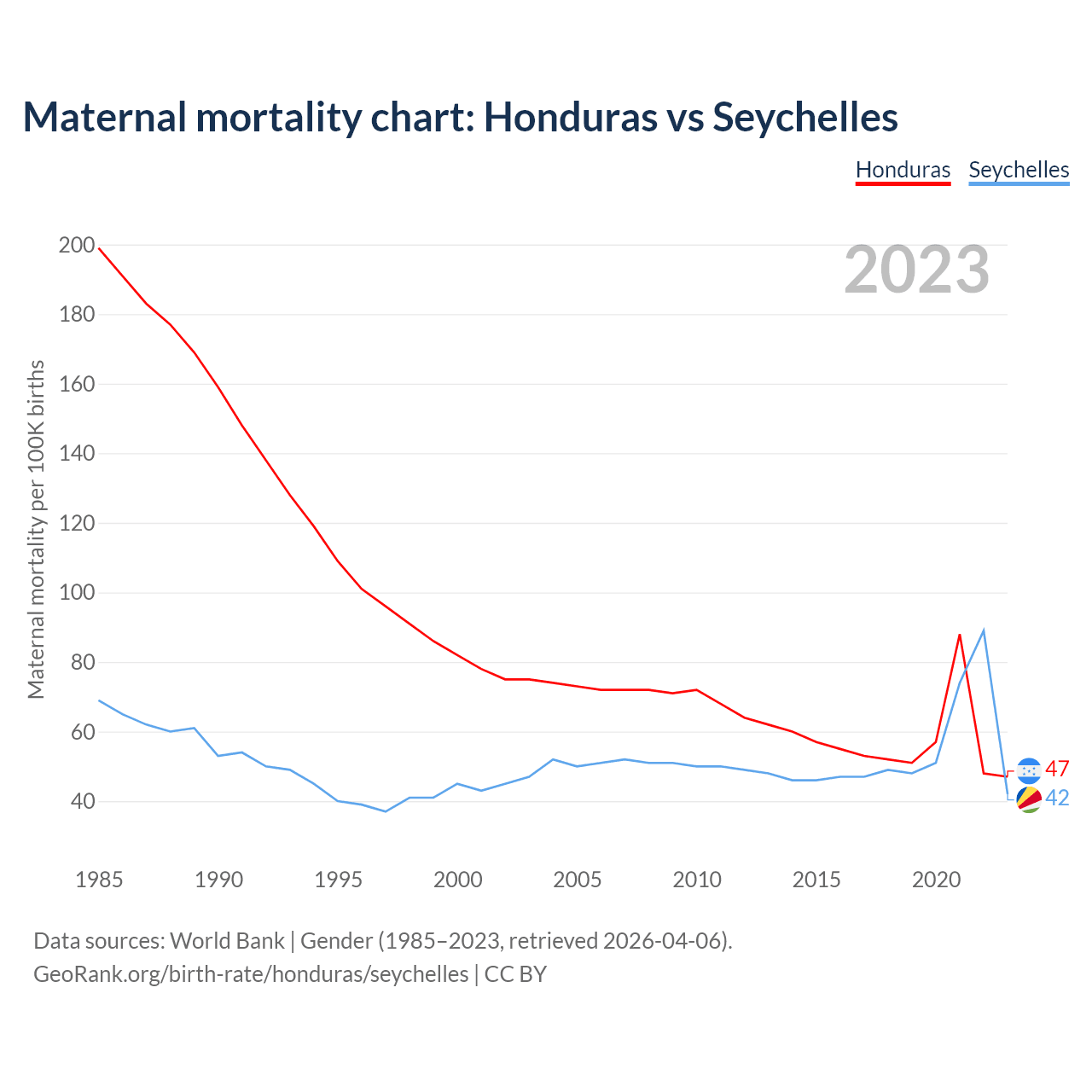 The maternal mortality rate, which is the probability of dying during childbirth or within 42 days of pregnancy termination, is 47 deaths per 100,000 live births in Honduras, compared to 42 deaths in the Seychelles.
