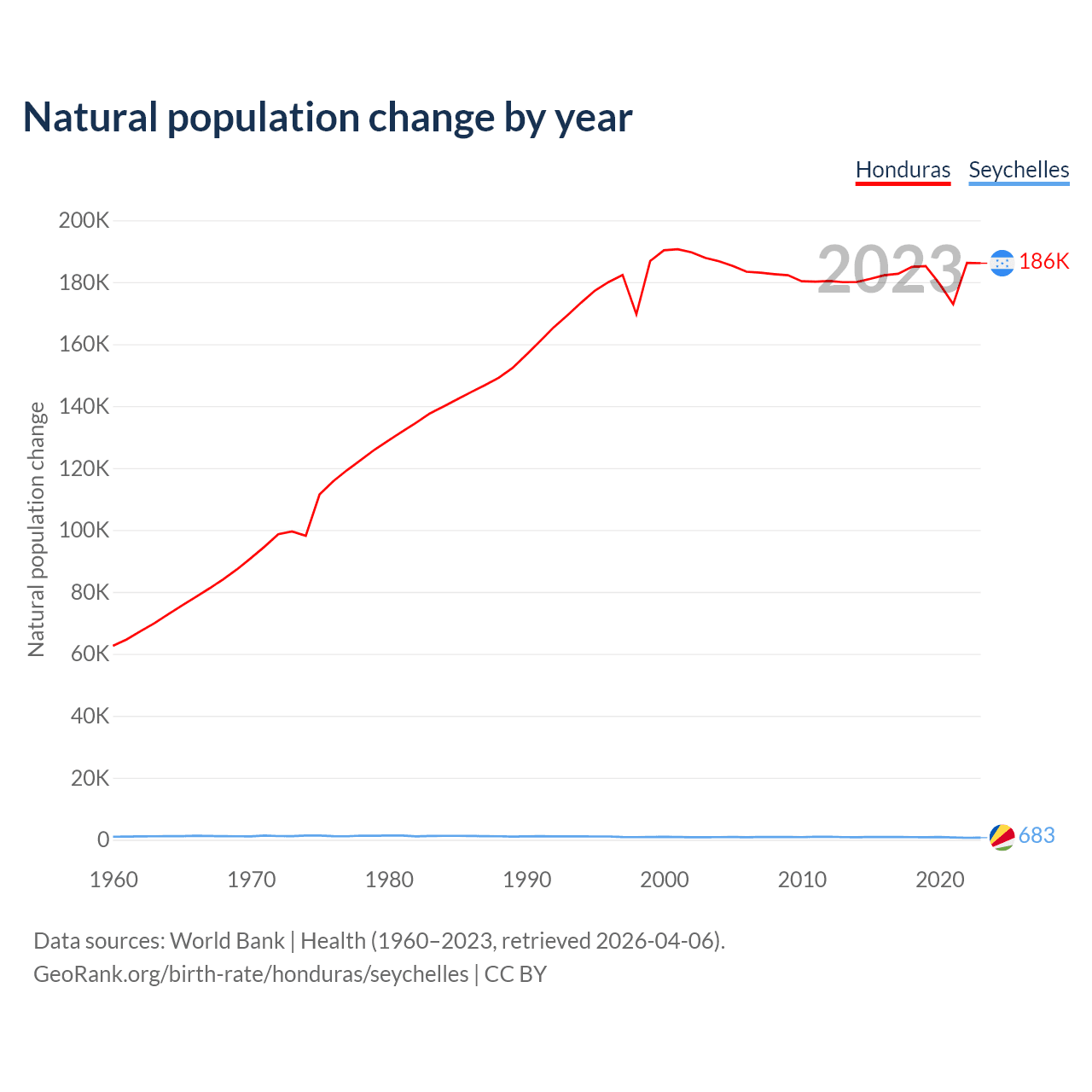 Honduras has an annual birth rate of 22 births per 1,000 people, compared to 13 for the Seychelles. The average number of children a woman is expected to have during her lifetime — the fertility rate, is 2.5 in Honduras and 2.02 in the Seychelles — 19.2% difference.