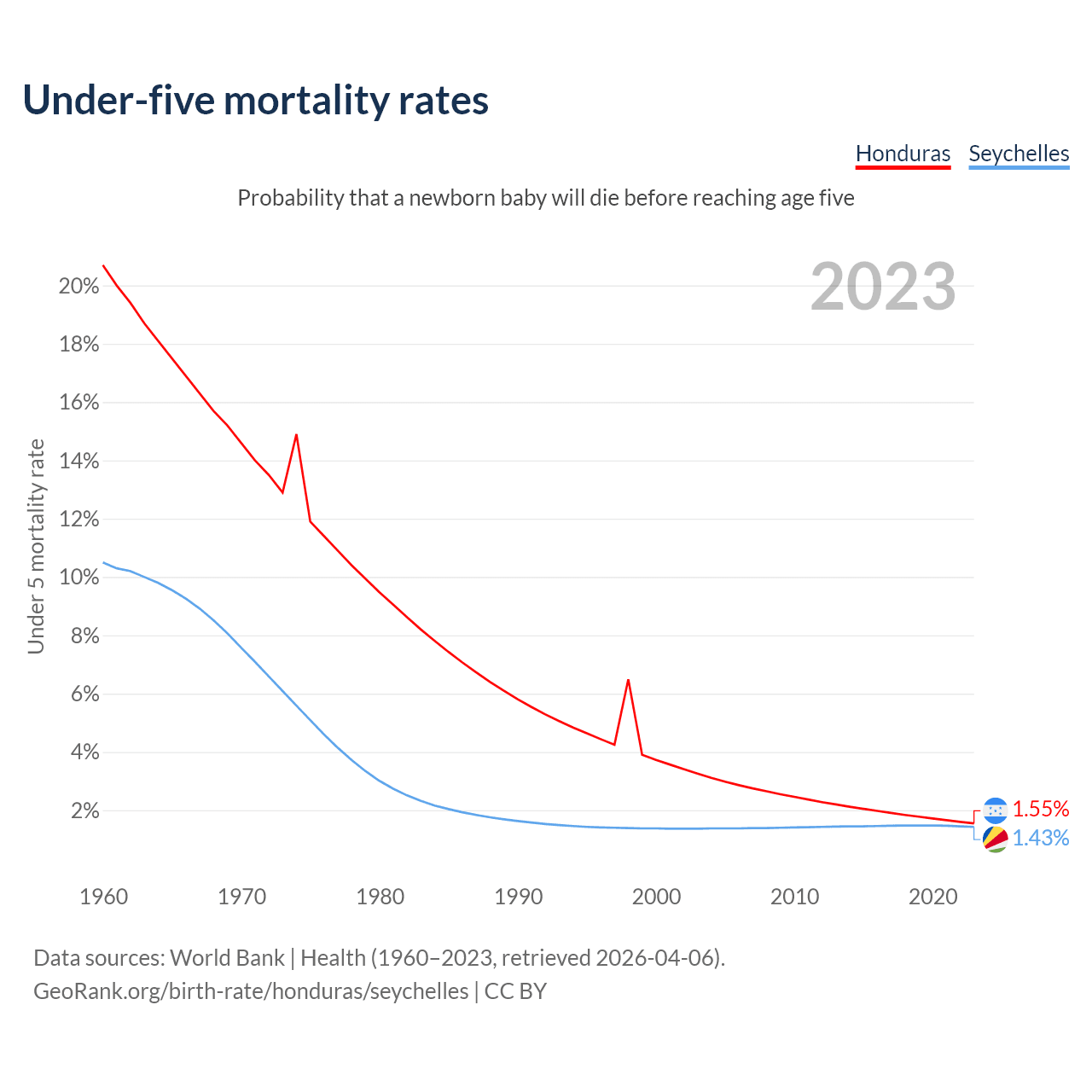 The chance that a newborn baby will die before reaching age five is 1.55% in Honduras and 1.43% in the Seychelles. Above is a chart with historical data on under-five mortality rates.