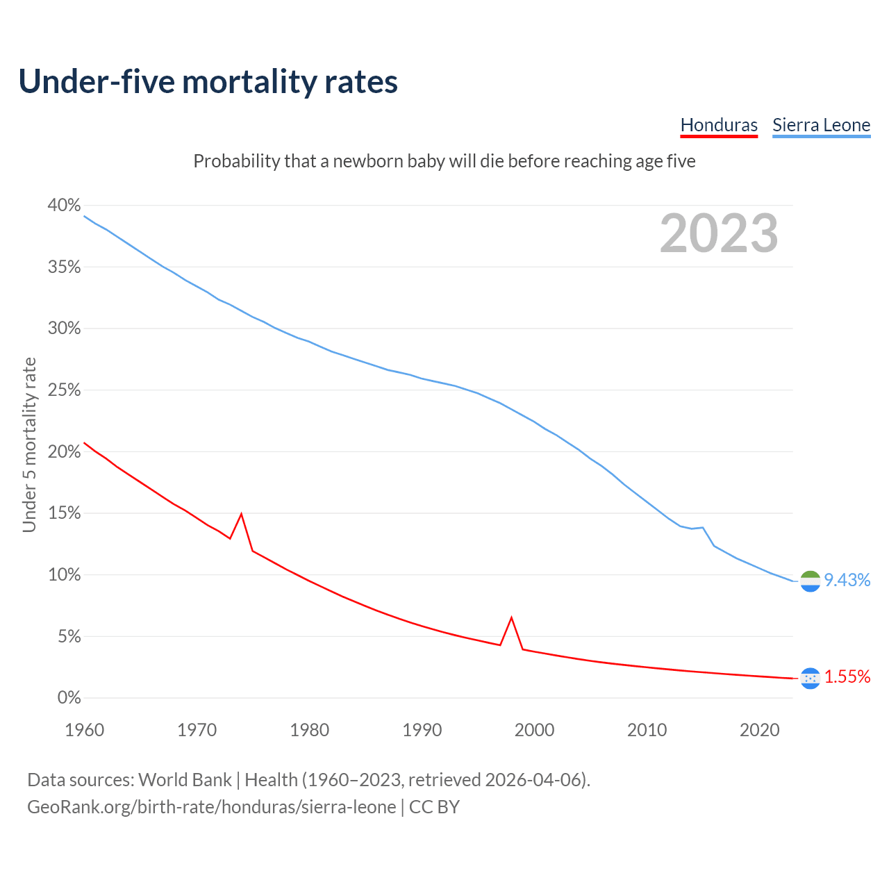 The chance that a newborn baby will die before reaching age five is 1.55% in Honduras and 9.43% in Sierra Leone. Above is a chart with historical data on under-five mortality rates.