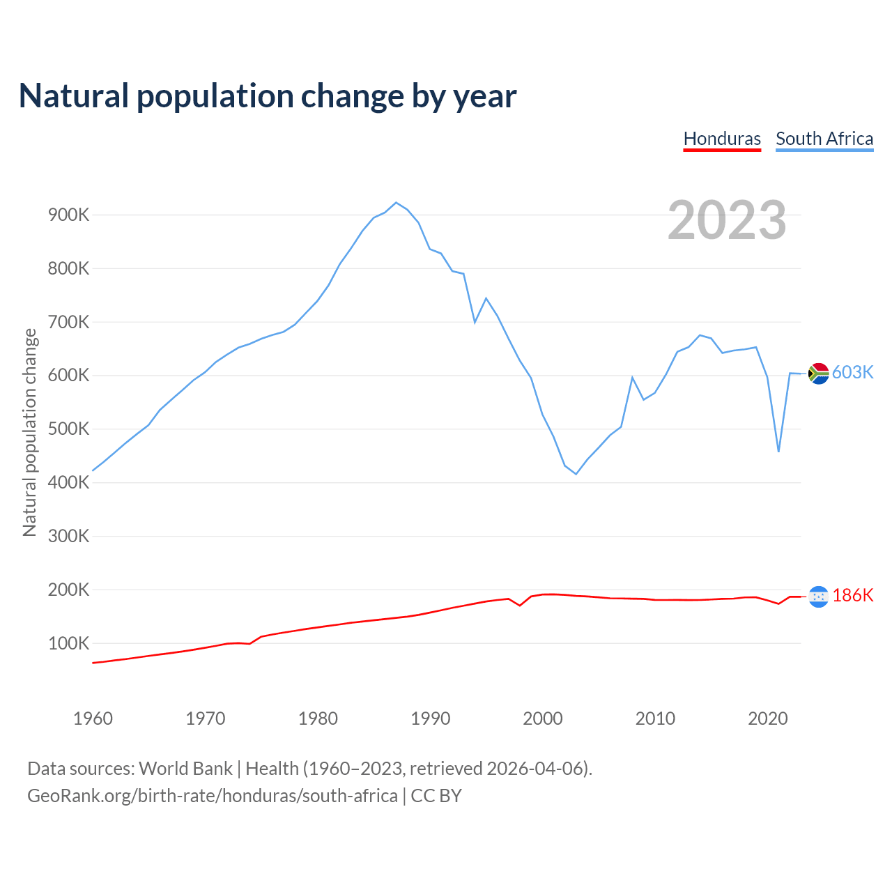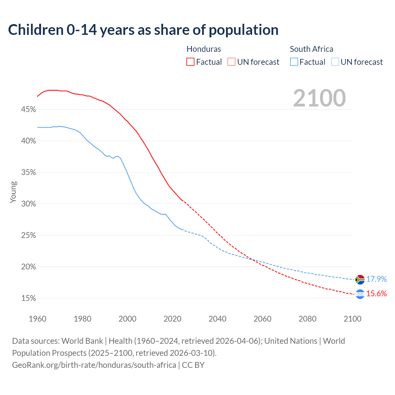According to the latest available data on birth rates, the fertility rate in Honduras was 2.5 children per woman in 2023, compared to 2.22 in South Africa in 2023. The replacement level is considered to be 2.1 children per woman.