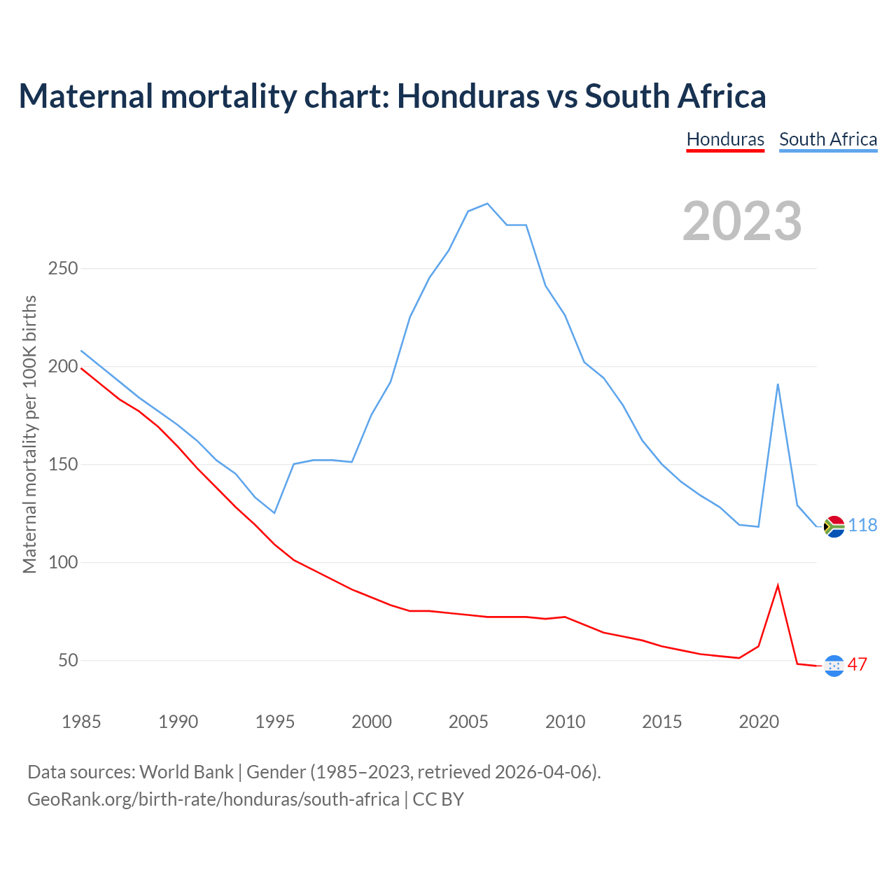 The maternal mortality rate, which is the probability of dying during childbirth or within 42 days of pregnancy termination, is 47 deaths per 100,000 live births in Honduras, compared to 118 deaths in South Africa.