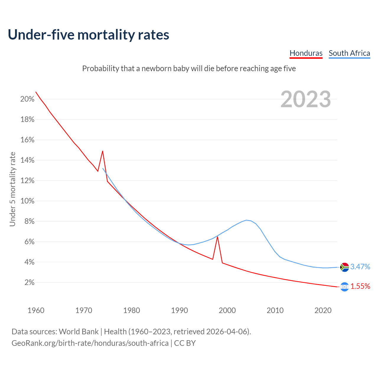 The chance that a newborn baby will die before reaching age five is 1.55% in Honduras and 3.47% in South Africa. Above is a chart with historical data on under-five mortality rates.