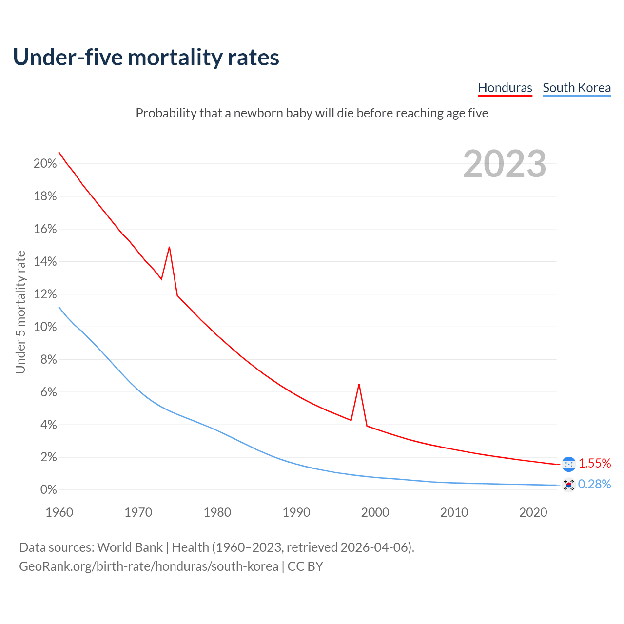 The chance that a newborn baby will die before reaching age five is 1.55% in Honduras and 0.28% in South Korea. Above is a chart with historical data on under-five mortality rates.