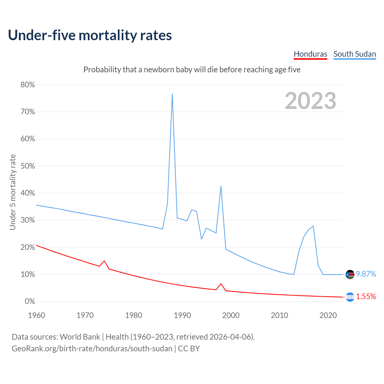 The chance that a newborn baby will die before reaching age five is 1.55% in Honduras and 9.87% in South Sudan. Above is a chart with historical data on under-five mortality rates.