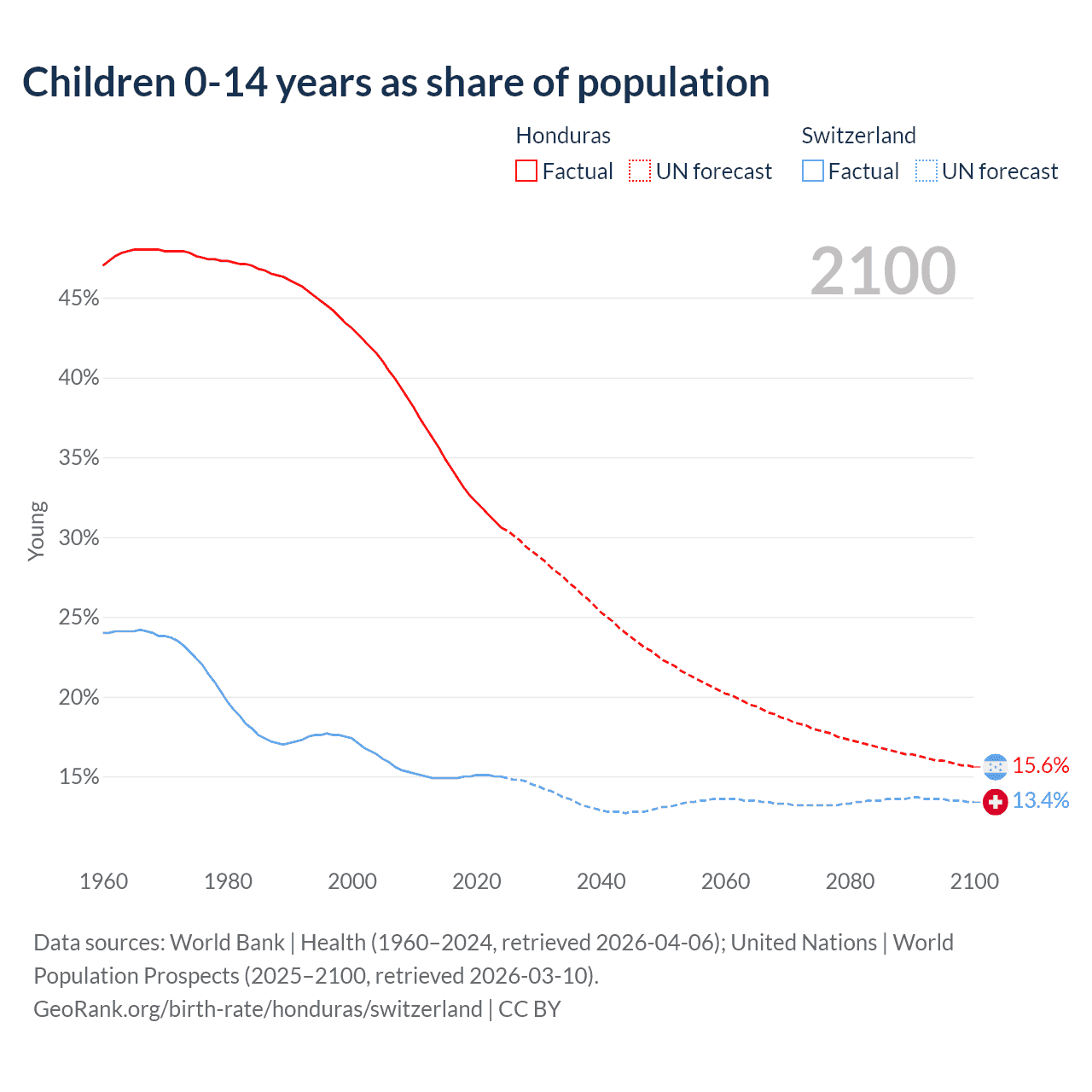 According to the latest available data on birth rates, the fertility rate in Honduras was 2.5 children per woman in 2023, compared to 1.33 in Switzerland in 2023. The replacement level is considered to be 2.1 children per woman.
