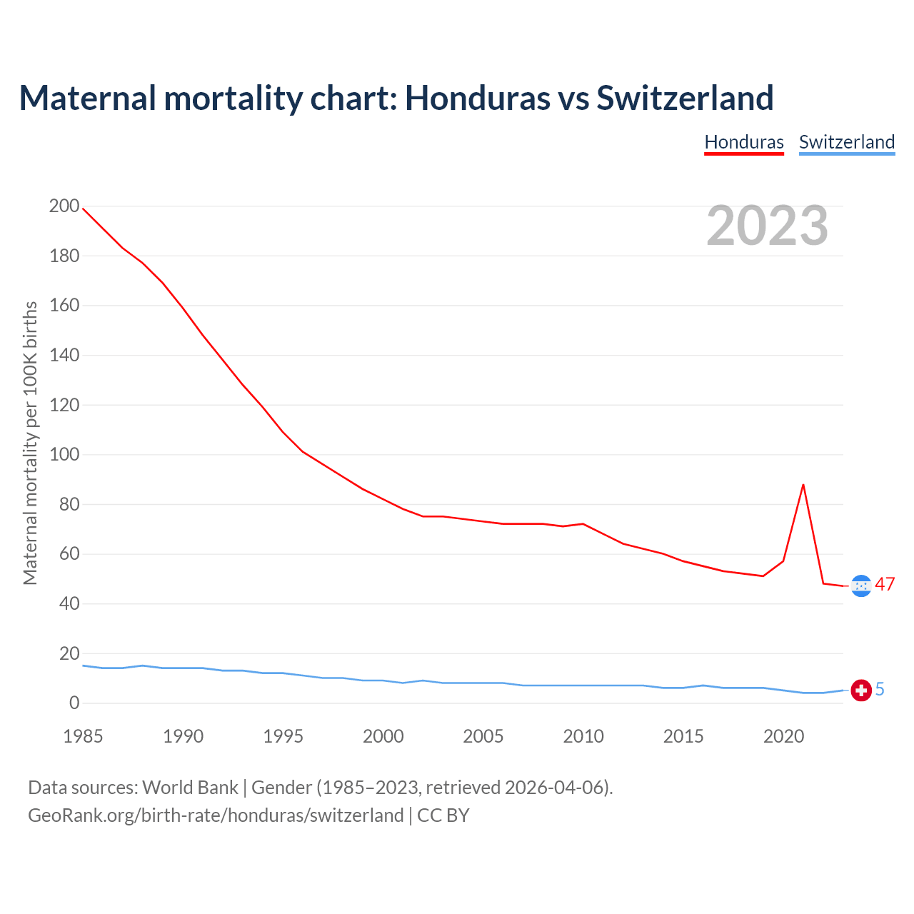 The maternal mortality rate, which is the probability of dying during childbirth or within 42 days of pregnancy termination, is 47 deaths per 100,000 live births in Honduras, compared to 5 deaths in Switzerland.