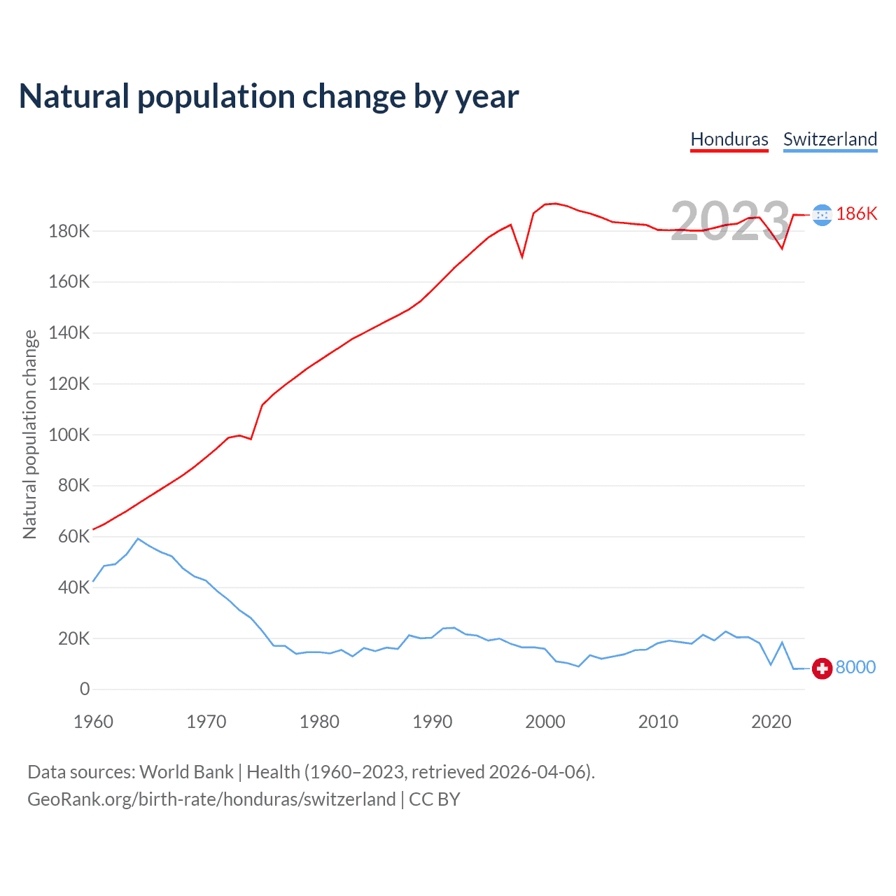 Honduras has an annual birth rate of 22 births per 1,000 people, compared to 9 for Switzerland. The average number of children a woman is expected to have during her lifetime — the fertility rate, is 2.5 in Honduras and 1.33 in Switzerland — 46.8% difference.