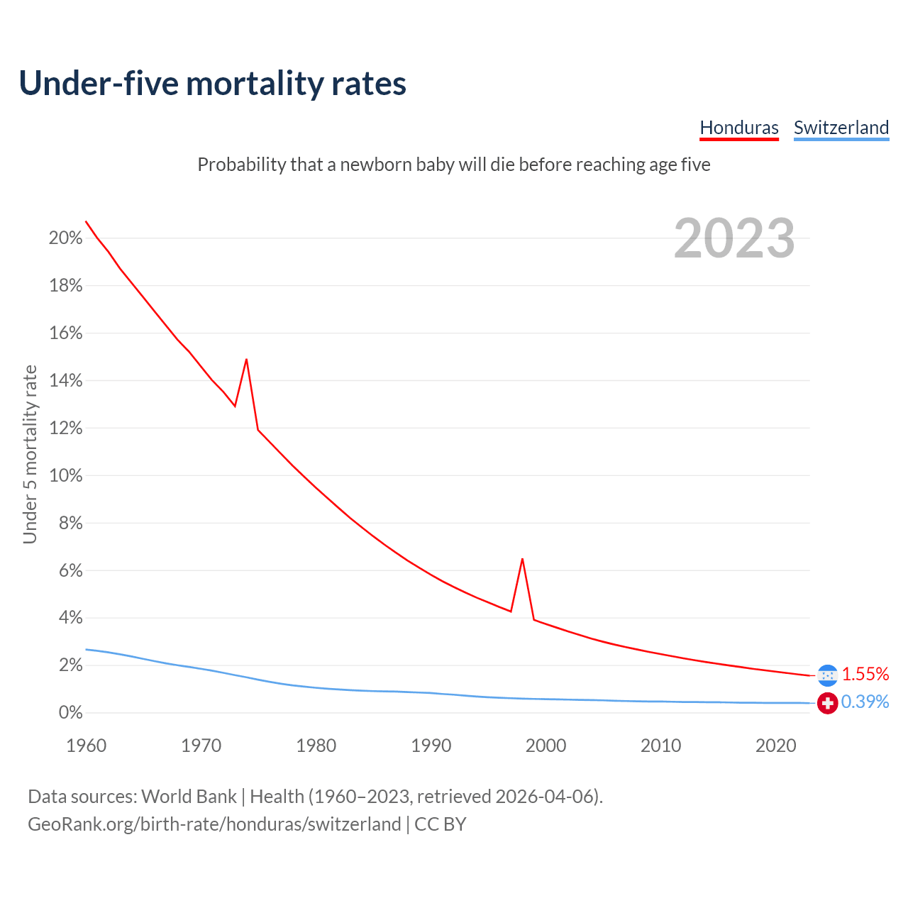 The chance that a newborn baby will die before reaching age five is 1.55% in Honduras and 0.39% in Switzerland. Above is a chart with historical data on under-five mortality rates.