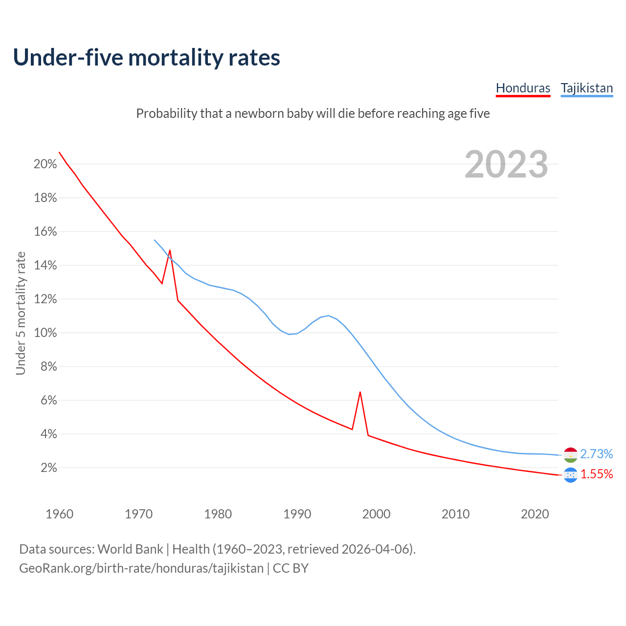 The chance that a newborn baby will die before reaching age five is 1.55% in Honduras and 2.73% in Tajikistan. Above is a chart with historical data on under-five mortality rates.