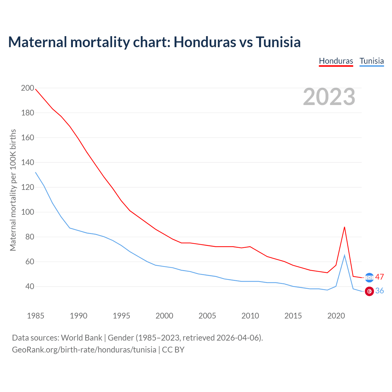 The maternal mortality rate, which is the probability of dying during childbirth or within 42 days of pregnancy termination, is 47 deaths per 100,000 live births in Honduras, compared to 36 deaths in Tunisia.