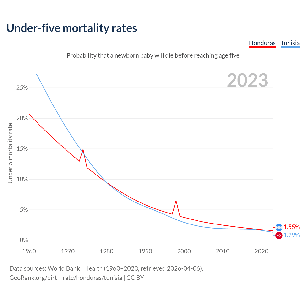 The chance that a newborn baby will die before reaching age five is 1.55% in Honduras and 1.29% in Tunisia. Above is a chart with historical data on under-five mortality rates.
