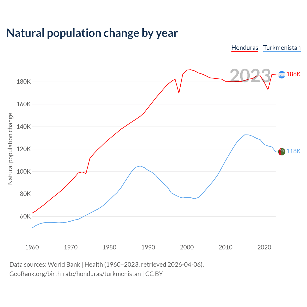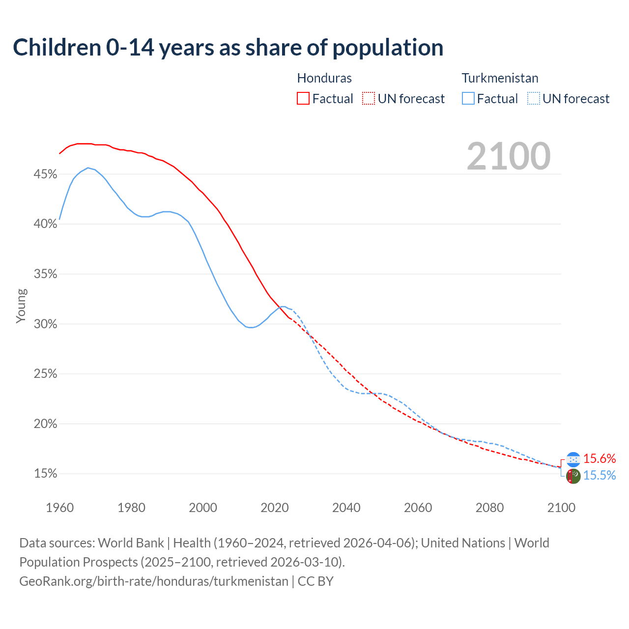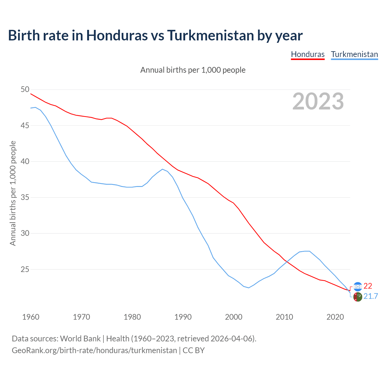 Honduras has an annual birth rate of 22 births per 1,000 people, compared to 21.7 for Turkmenistan. The average number of children a woman is expected to have during her lifetime — the fertility rate, is 2.5 in Honduras and 2.69 in Turkmenistan — 7.6% difference.