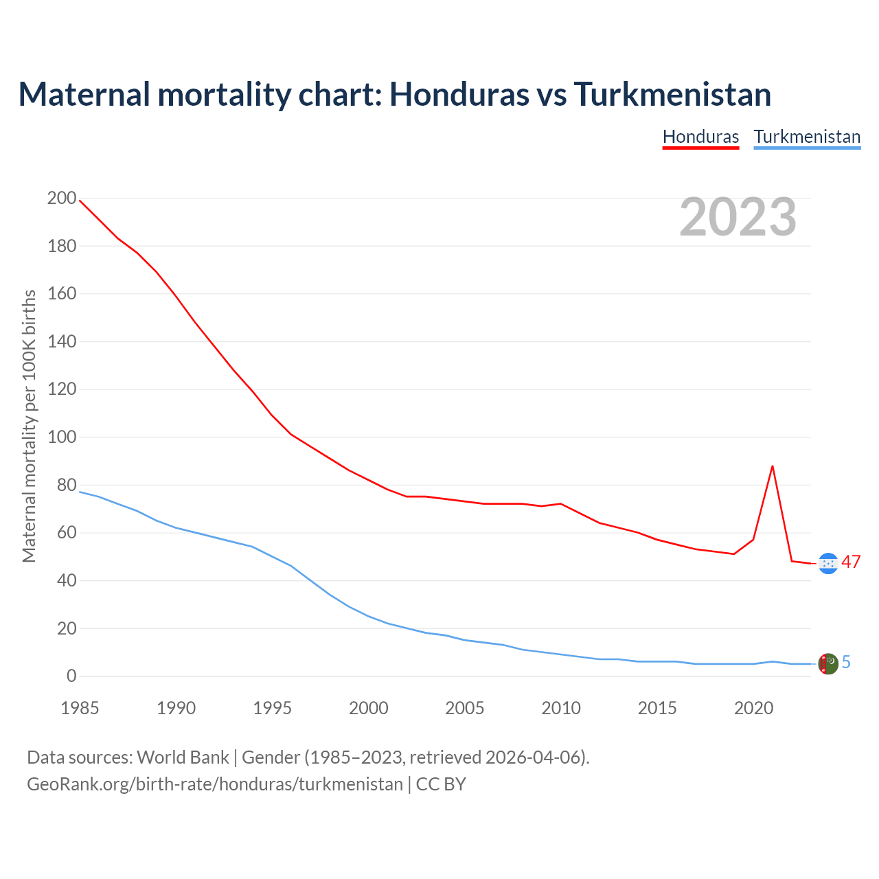 The maternal mortality rate, which is the probability of dying during childbirth or within 42 days of pregnancy termination, is 47 deaths per 100,000 live births in Honduras, compared to 5 deaths in Turkmenistan.