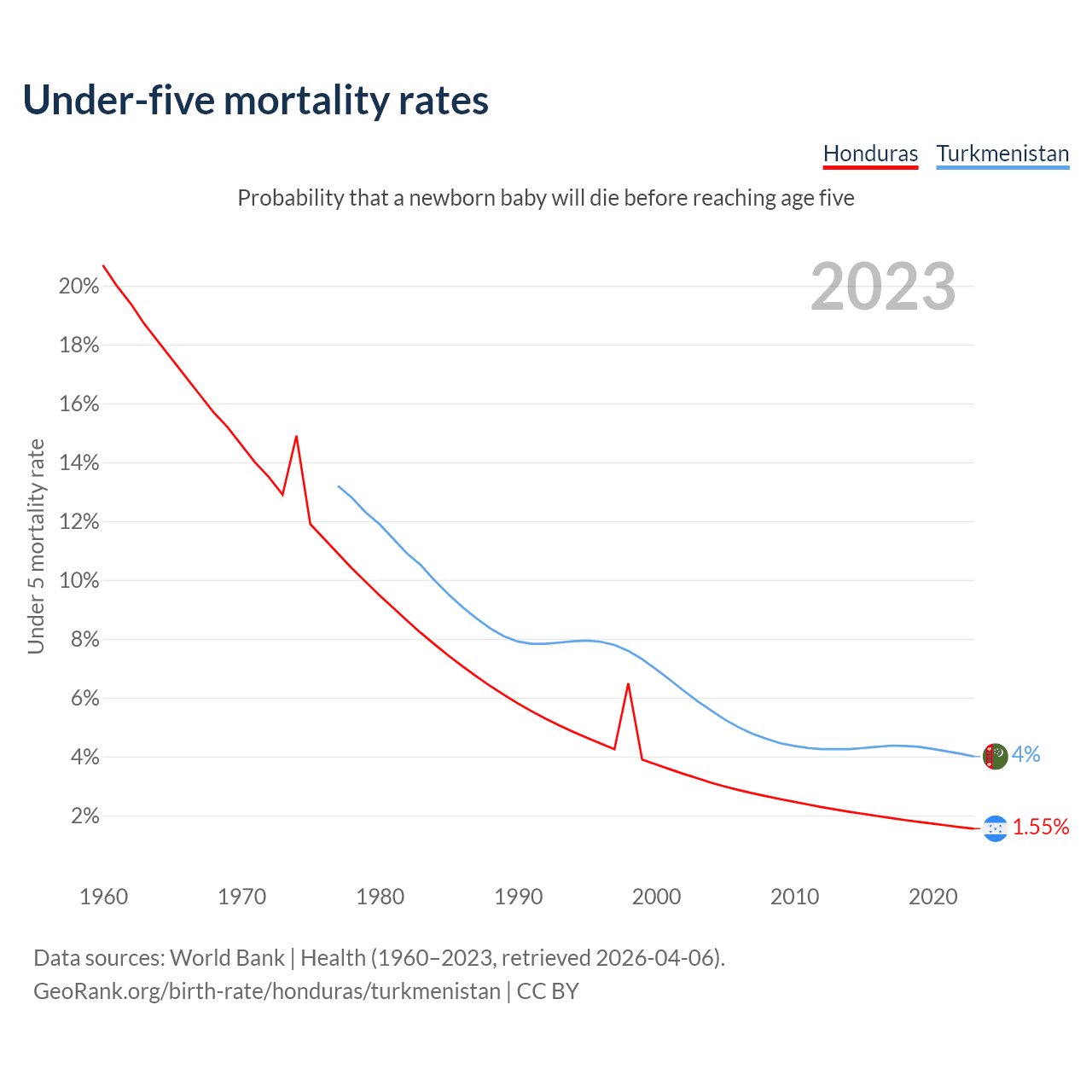 The chance that a newborn baby will die before reaching age five is 1.55% in Honduras and 4% in Turkmenistan. Above is a chart with historical data on under-five mortality rates.