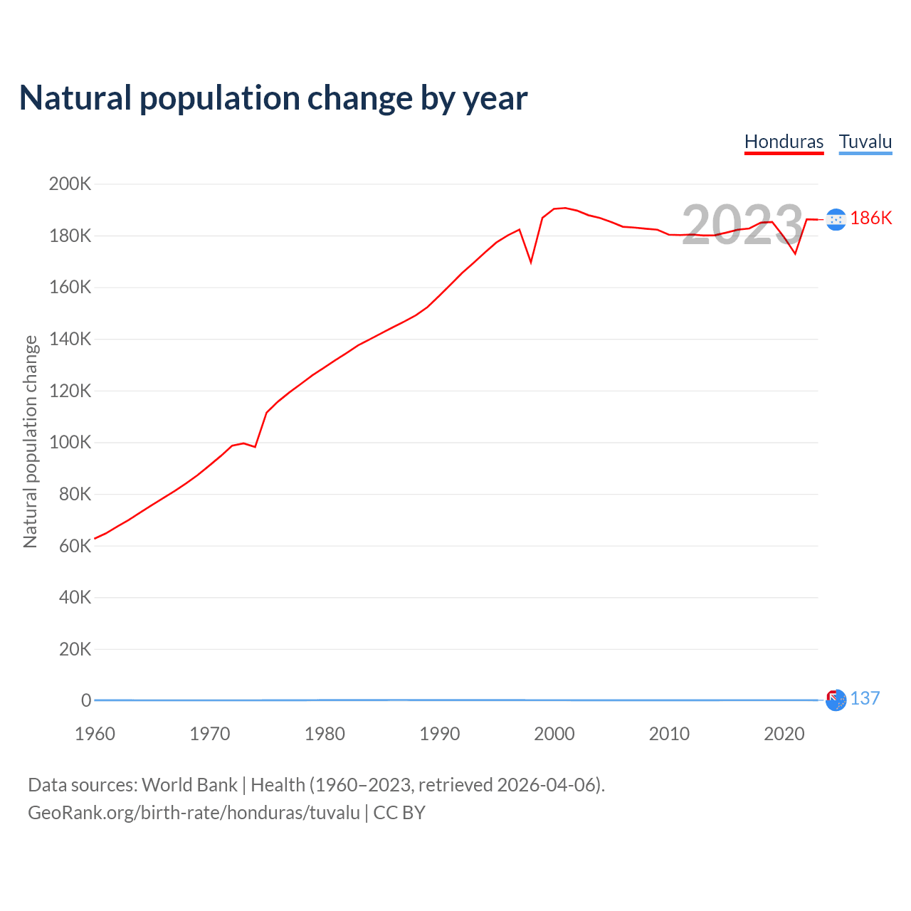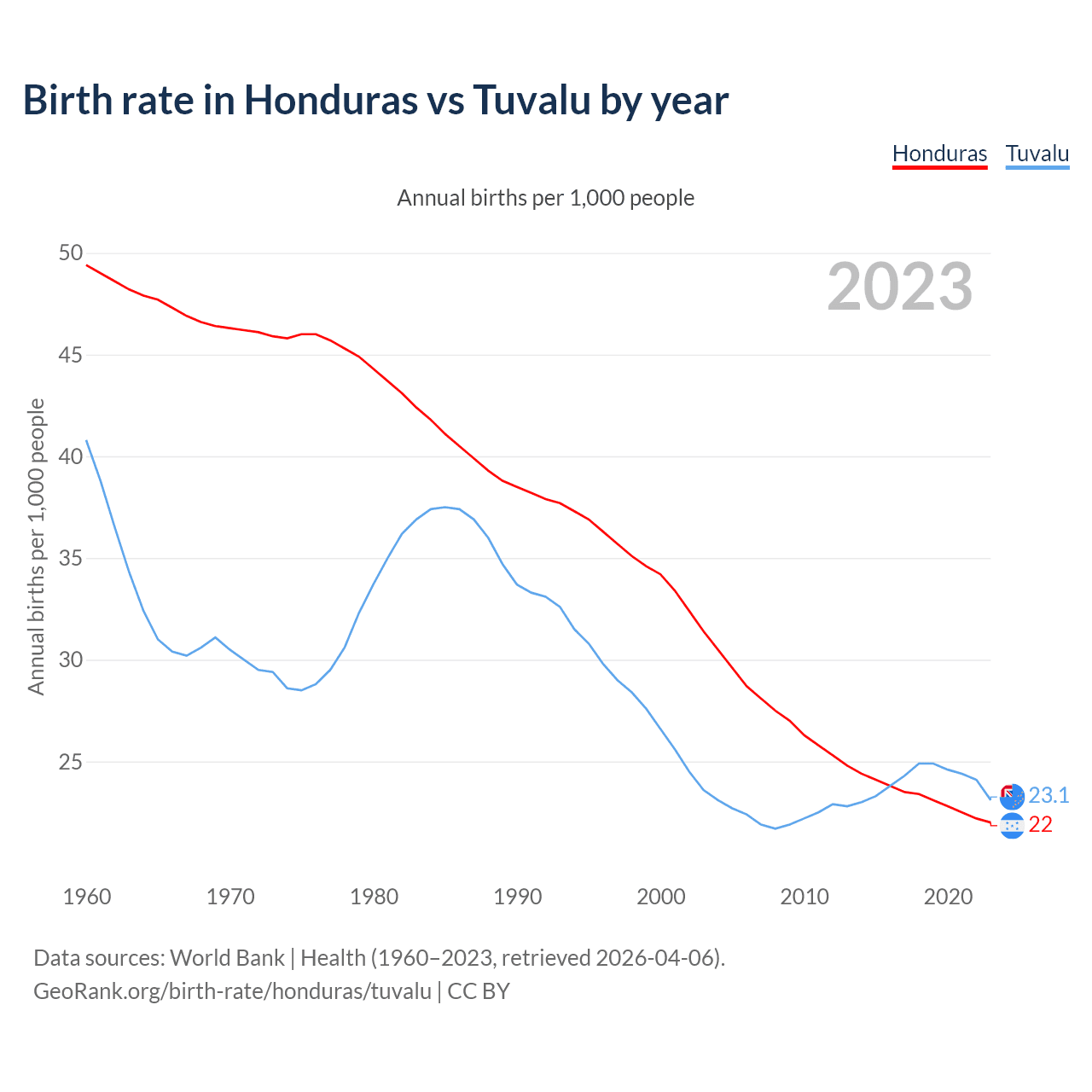 Honduras has an annual birth rate of 22 births per 1,000 people, compared to 23.1 for Tuvalu. The average number of children a woman is expected to have during her lifetime — the fertility rate, is 2.5 in Honduras and 3.21 in Tuvalu — 28.3% difference.