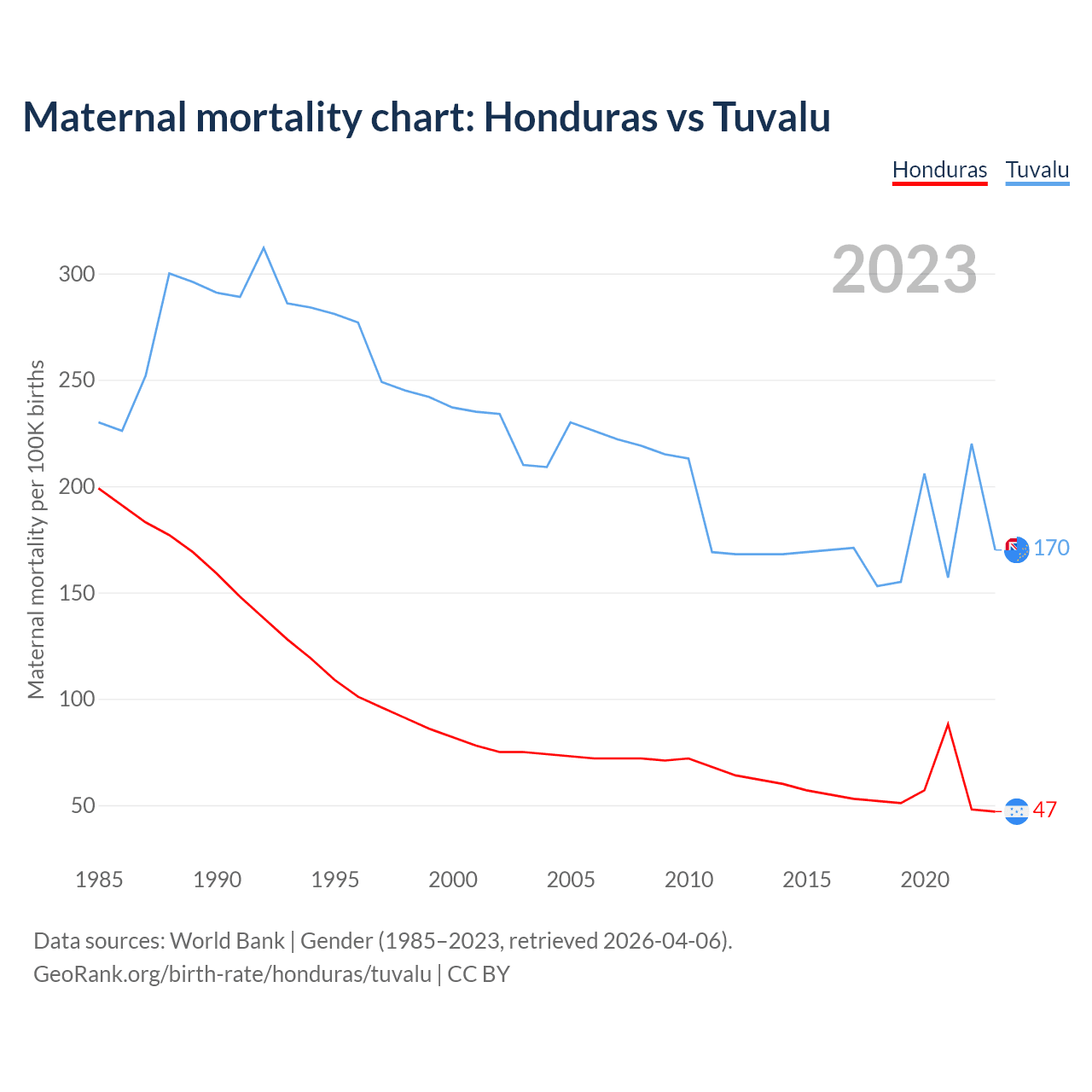 The maternal mortality rate, which is the probability of dying during childbirth or within 42 days of pregnancy termination, is 47 deaths per 100,000 live births in Honduras, compared to 170 deaths in Tuvalu.