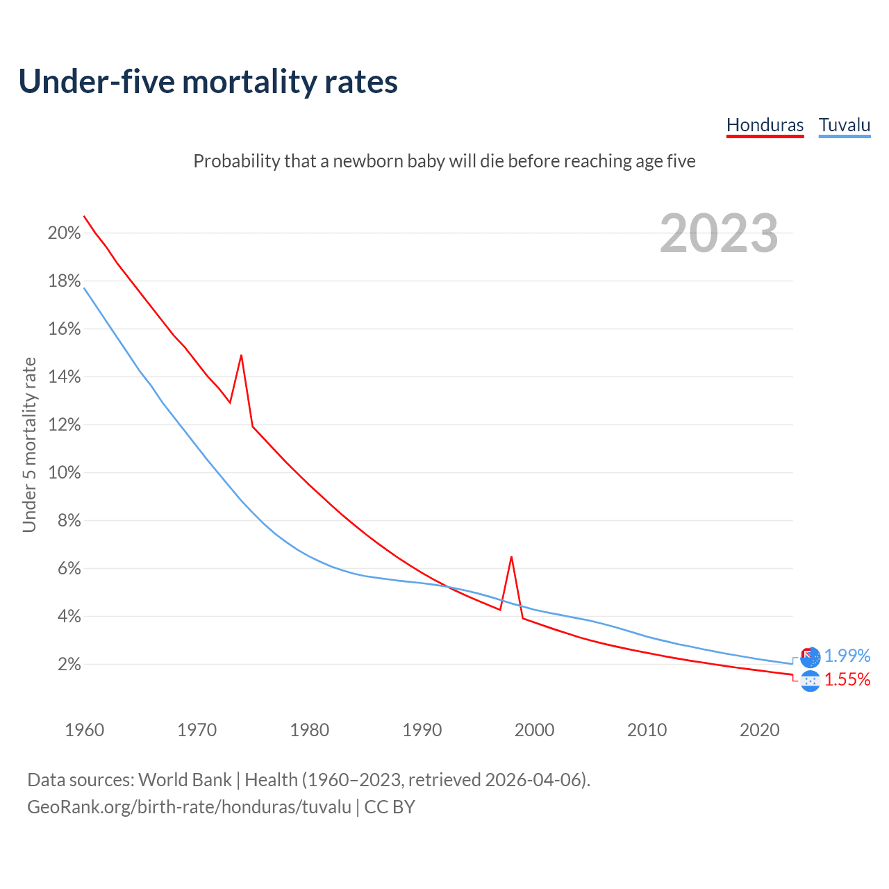 The chance that a newborn baby will die before reaching age five is 1.55% in Honduras and 1.99% in Tuvalu. Above is a chart with historical data on under-five mortality rates.