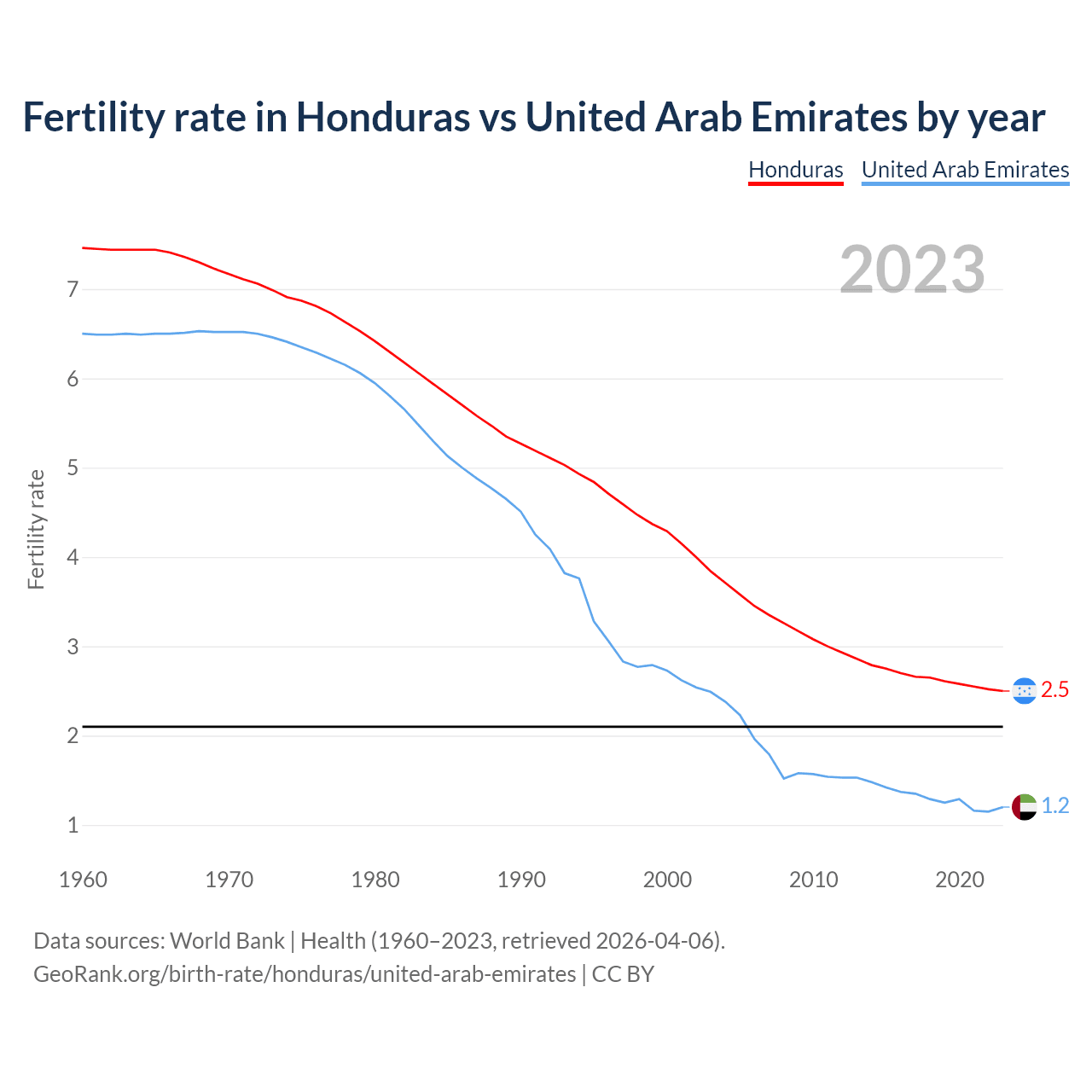 1960 vs 2023, the fertility rate has decreased by 66.5% in Honduras and by 81.5% in the United Arab Emirates — in 1960, it was 7.46 and 6.5, respectively.