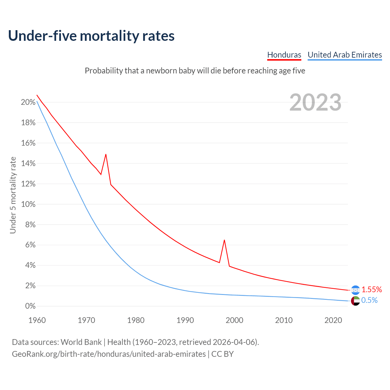 The chance that a newborn baby will die before reaching age five is 1.55% in Honduras and 0.5% in the United Arab Emirates. Above is a chart with historical data on under-five mortality rates.