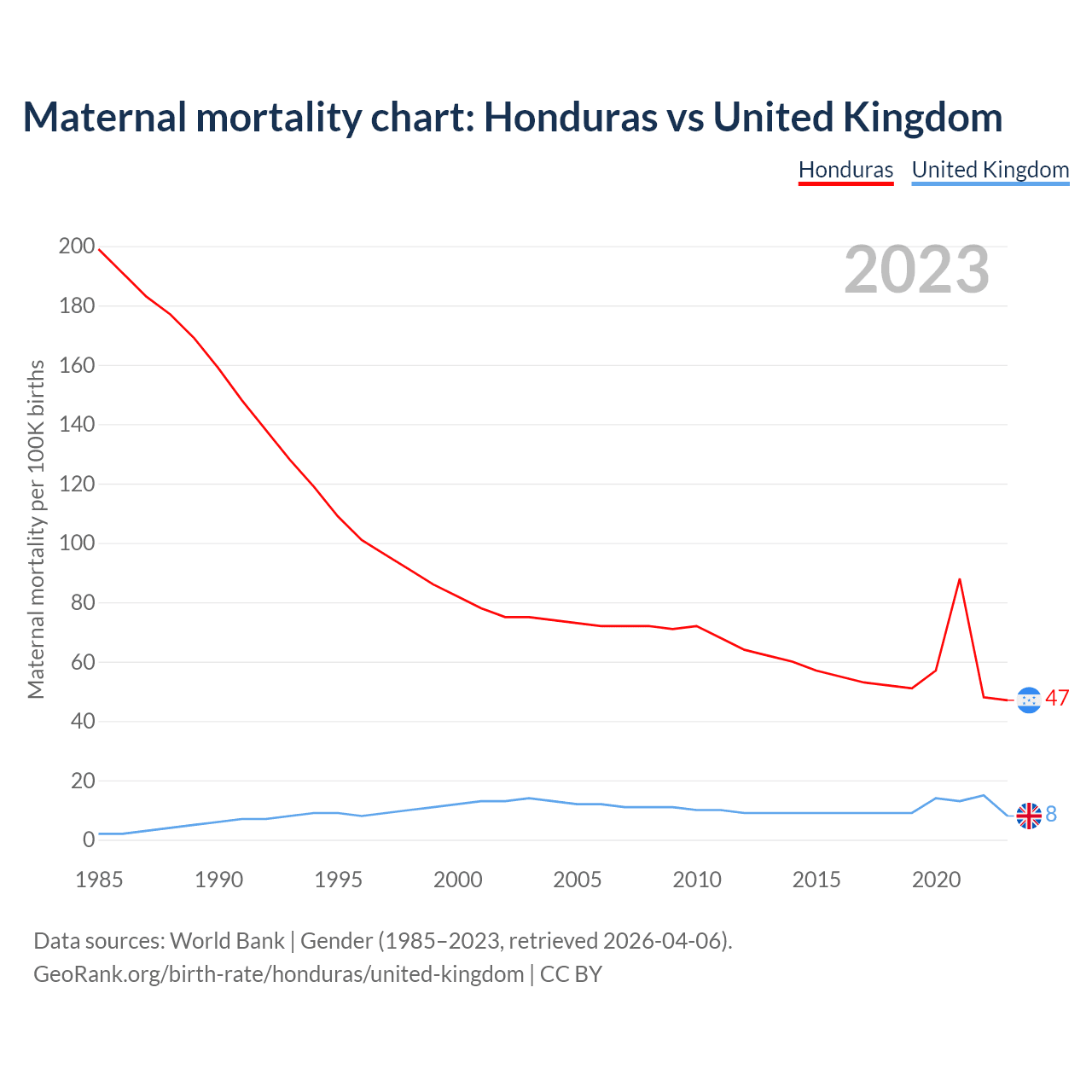 The maternal mortality rate, which is the probability of dying during childbirth or within 42 days of pregnancy termination, is 47 deaths per 100,000 live births in Honduras, compared to 8 deaths in the United Kingdom.