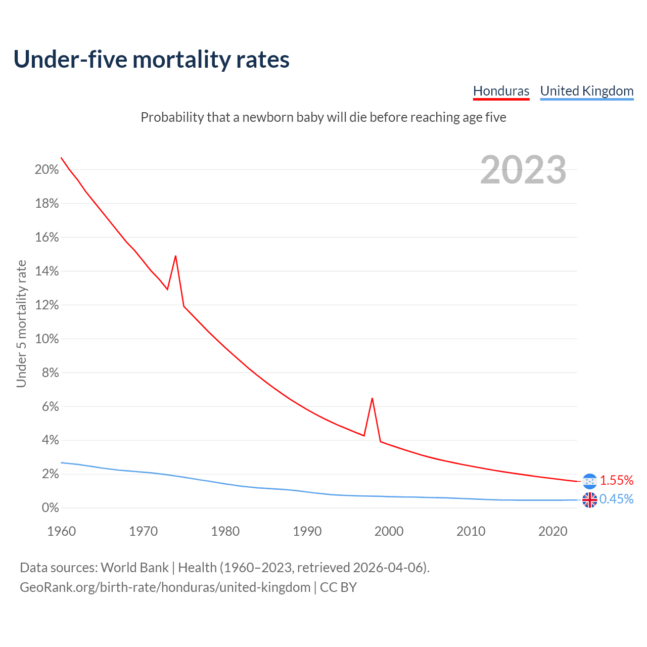 The chance that a newborn baby will die before reaching age five is 1.55% in Honduras and 0.45% in the United Kingdom. Above is a chart with historical data on under-five mortality rates.