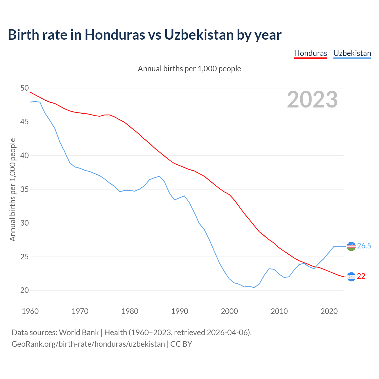 According to the latest available data on birth rates, the fertility rate in Honduras was 2.5 children per woman in 2023, compared to 3.5 in Uzbekistan in 2023. The replacement level is considered to be 2.1 children per woman.