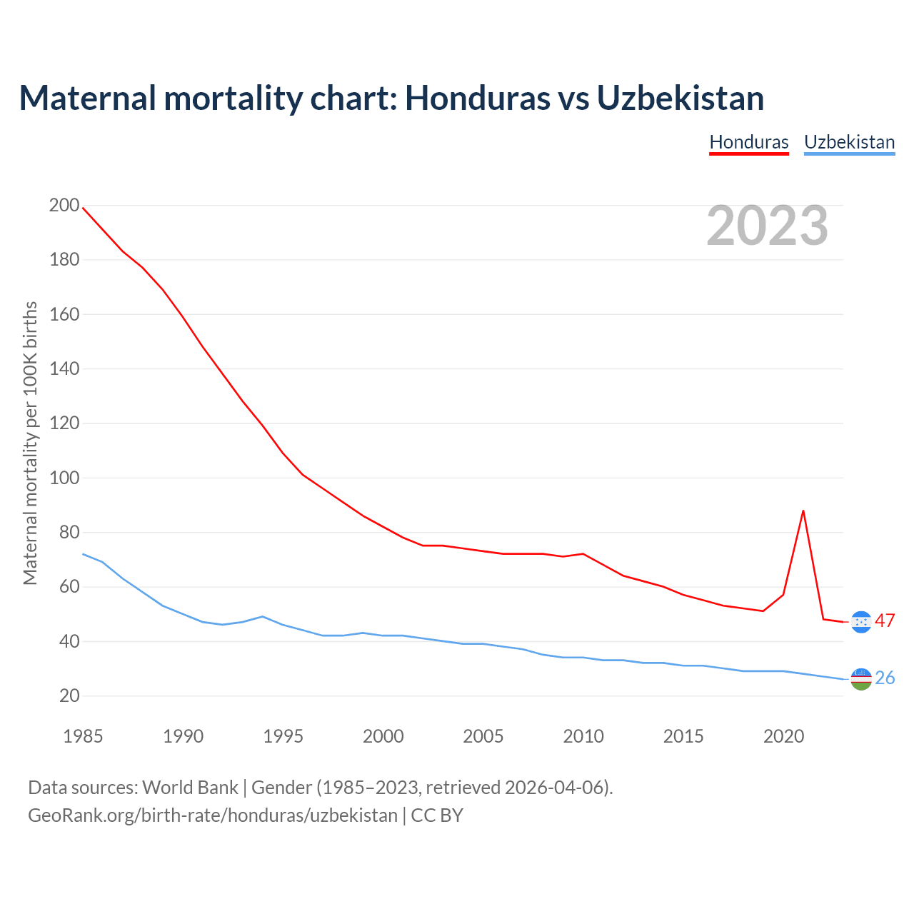 The maternal mortality rate, which is the probability of dying during childbirth or within 42 days of pregnancy termination, is 47 deaths per 100,000 live births in Honduras, compared to 26 deaths in Uzbekistan.