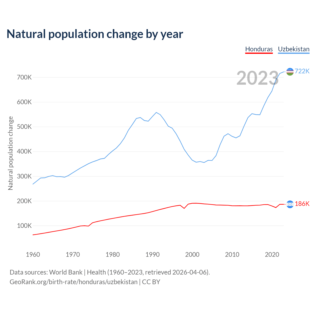 Honduras has an annual birth rate of 22 births per 1,000 people, compared to 26.5 for Uzbekistan. The average number of children a woman is expected to have during her lifetime — the fertility rate, is 2.5 in Honduras and 3.5 in Uzbekistan — 40% difference.