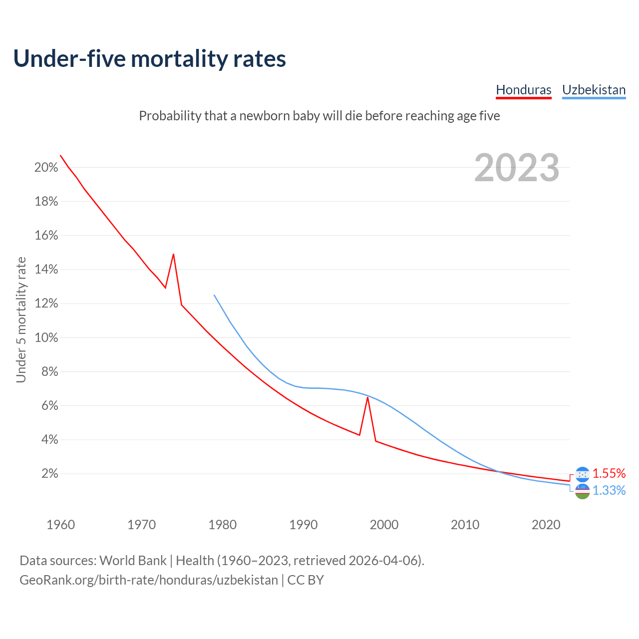 The chance that a newborn baby will die before reaching age five is 1.55% in Honduras and 1.33% in Uzbekistan. Above is a chart with historical data on under-five mortality rates.