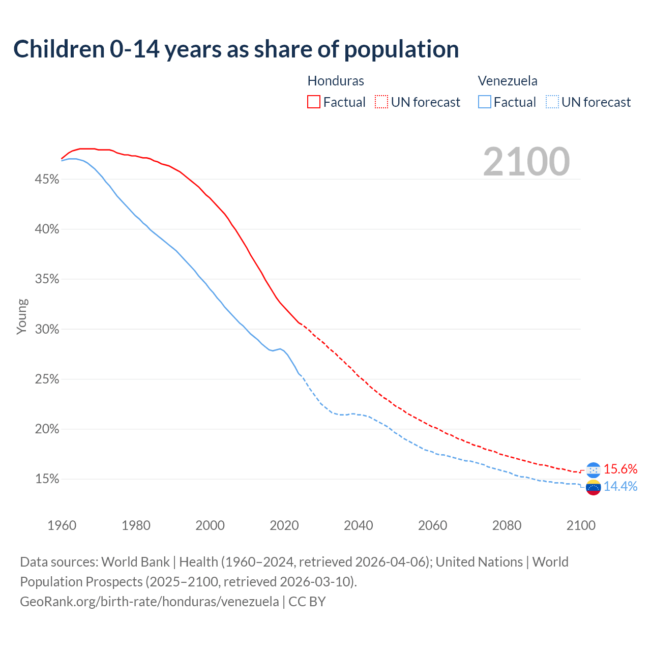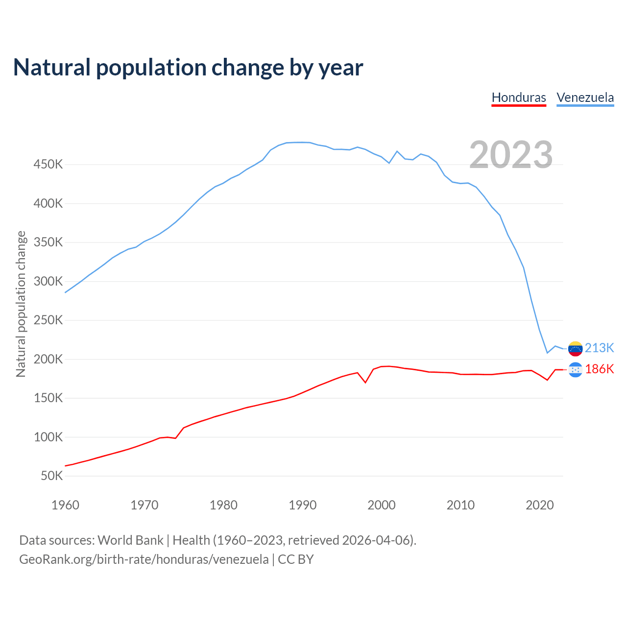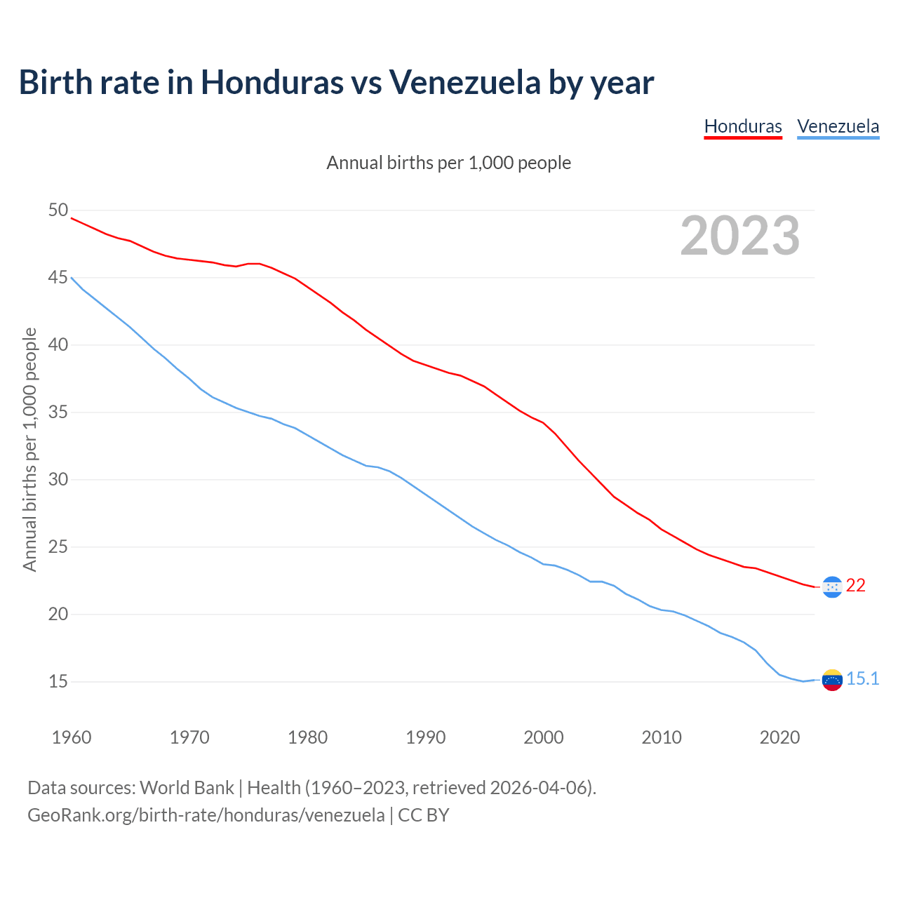According to the latest available data on birth rates, the fertility rate in Honduras was 2.5 children per woman in 2023, compared to 2.08 in Venezuela in 2023. The replacement level is considered to be 2.1 children per woman.
