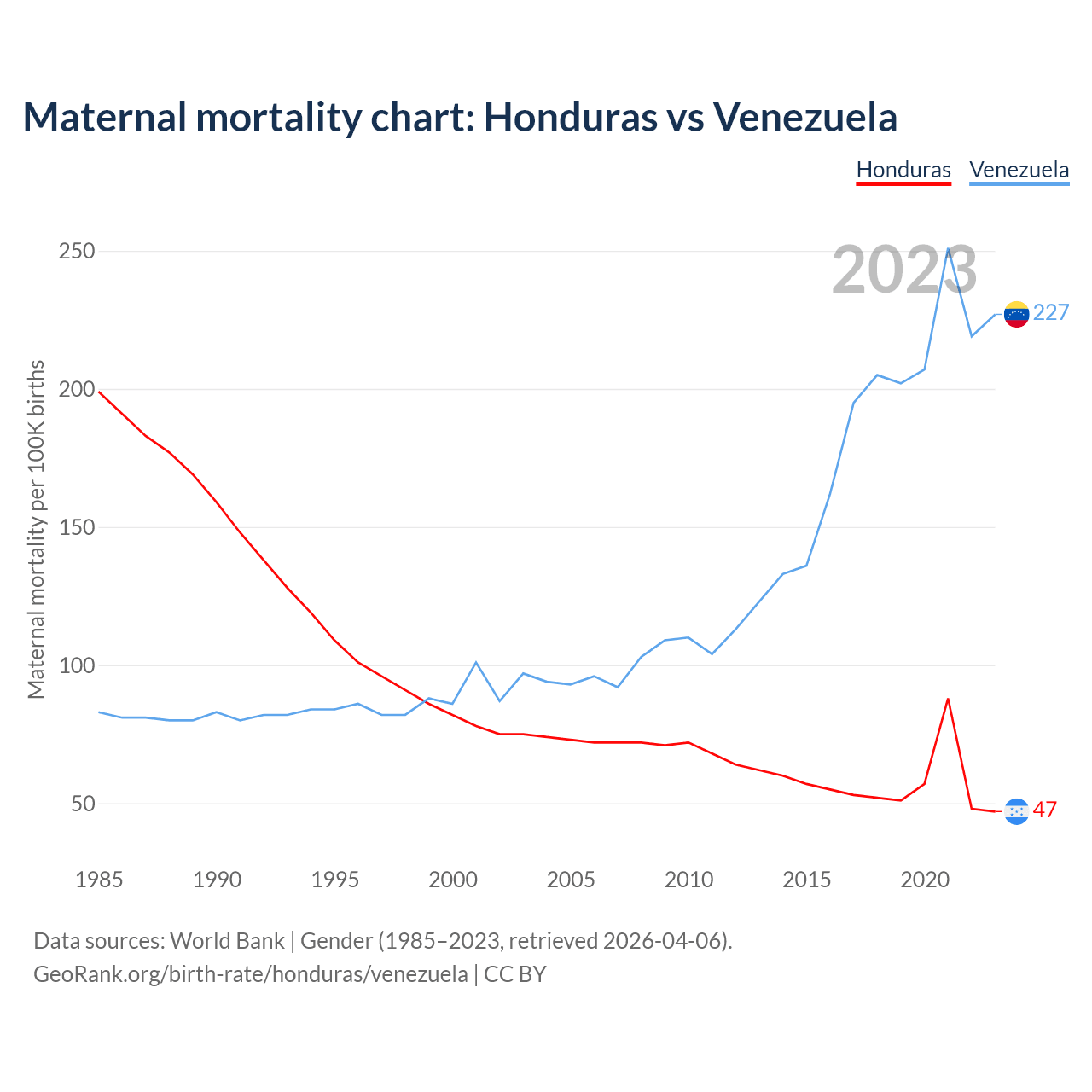 The maternal mortality rate, which is the probability of dying during childbirth or within 42 days of pregnancy termination, is 47 deaths per 100,000 live births in Honduras, compared to 227 deaths in Venezuela.