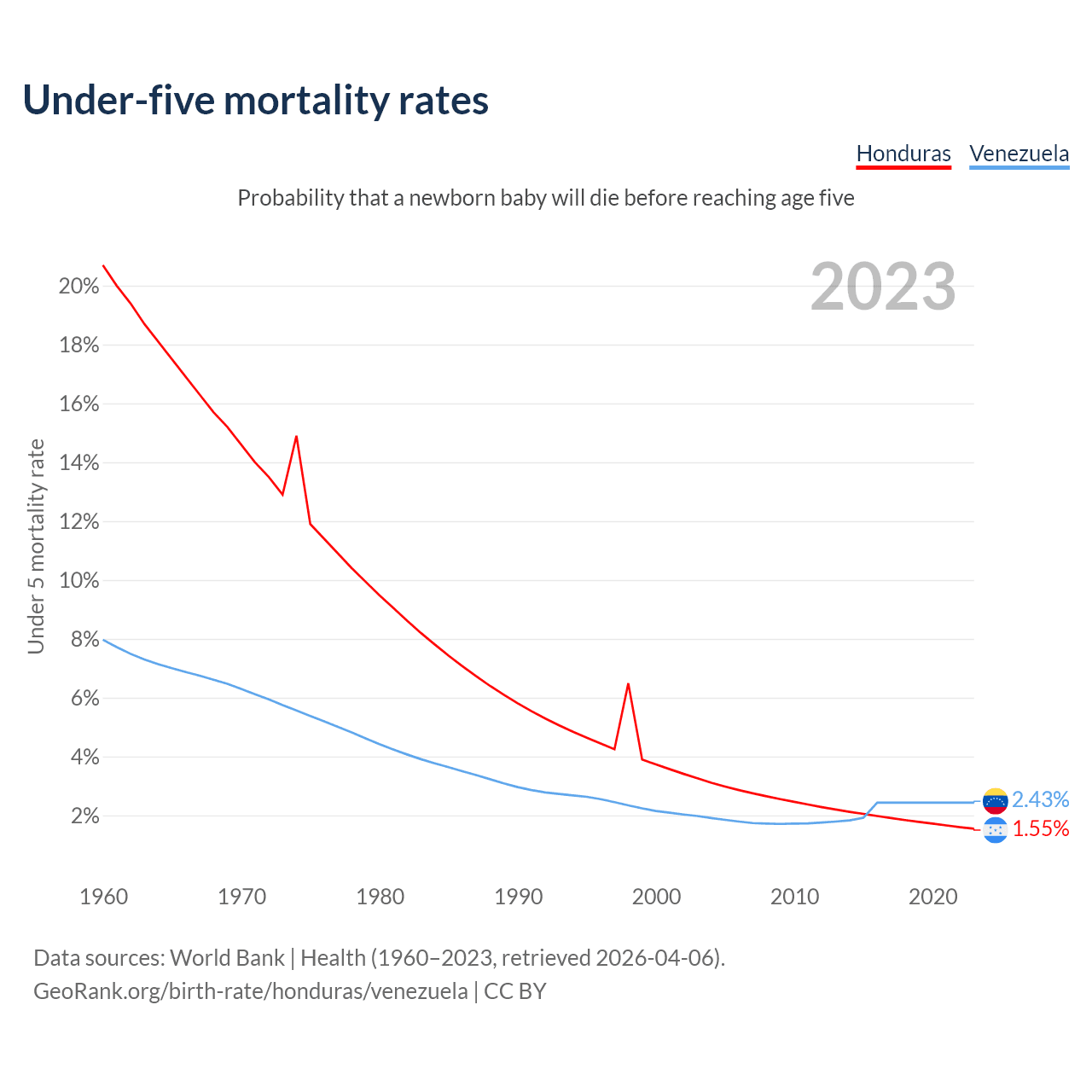 The chance that a newborn baby will die before reaching age five is 1.55% in Honduras and 2.43% in Venezuela. Above is a chart with historical data on under-five mortality rates.