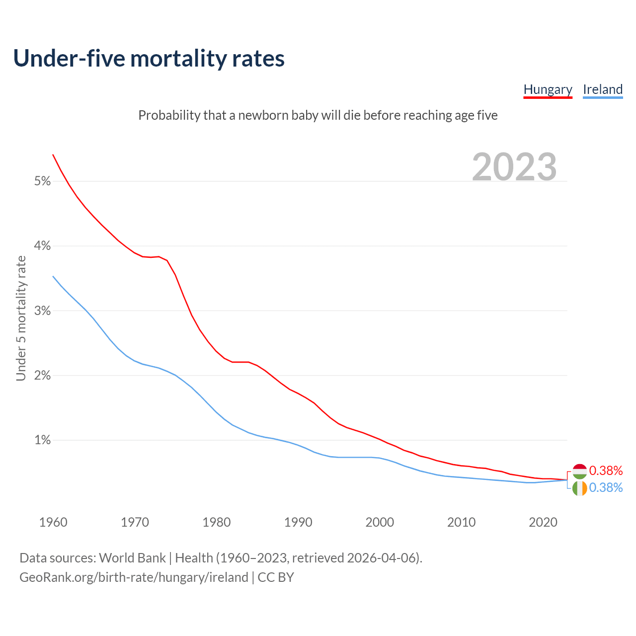 The chance that a newborn baby will die before reaching age five is 0.38% in Hungary and 0.38% in Ireland. Above is a chart with historical data on under-five mortality rates.