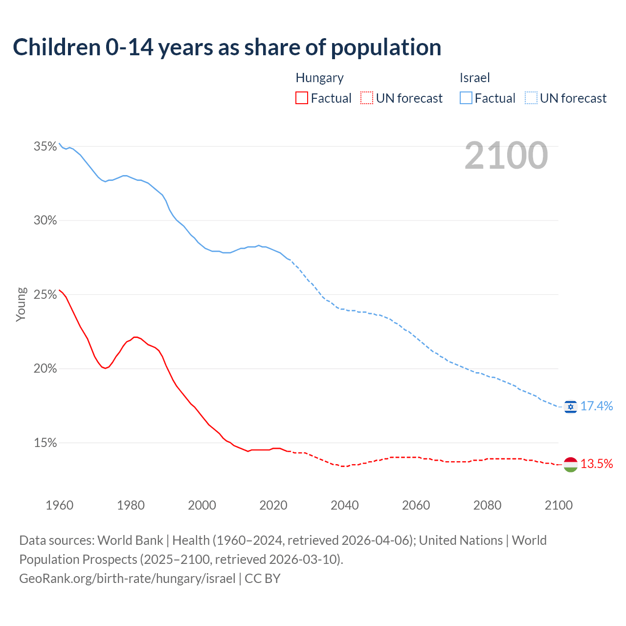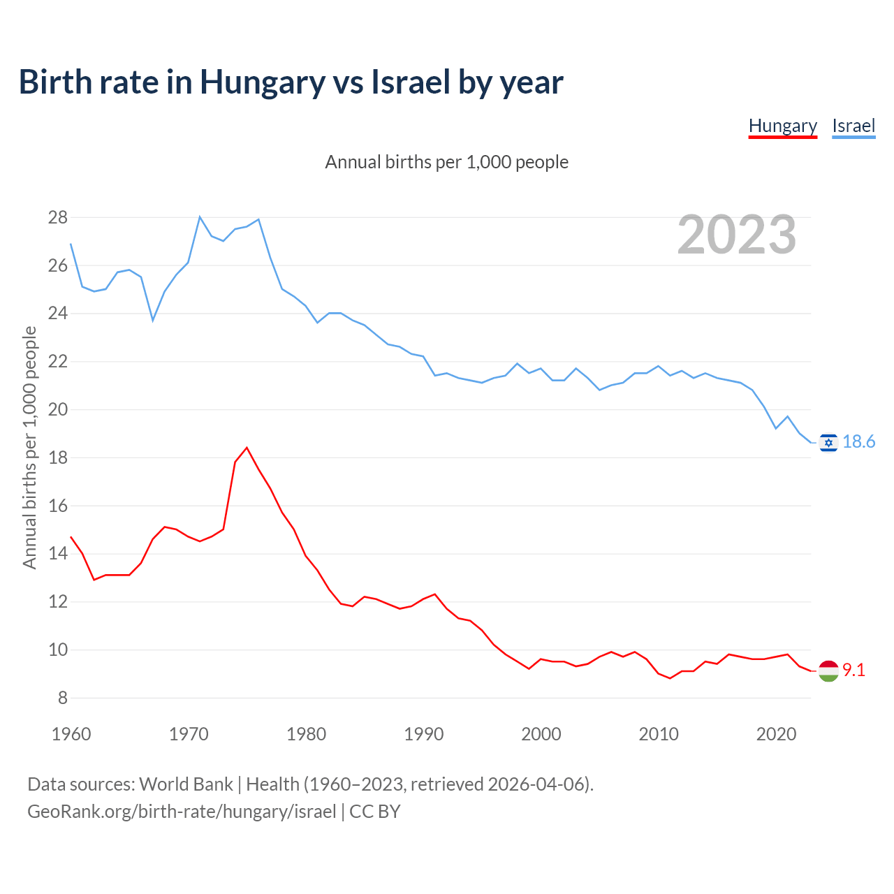 Hungary has an annual birth rate of 9.1 births per 1,000 people, compared to 18.6 for Israel. The average number of children a woman is expected to have during her lifetime — the fertility rate, is 1.51 in Hungary and 2.85 in Israel — 88.7% difference.