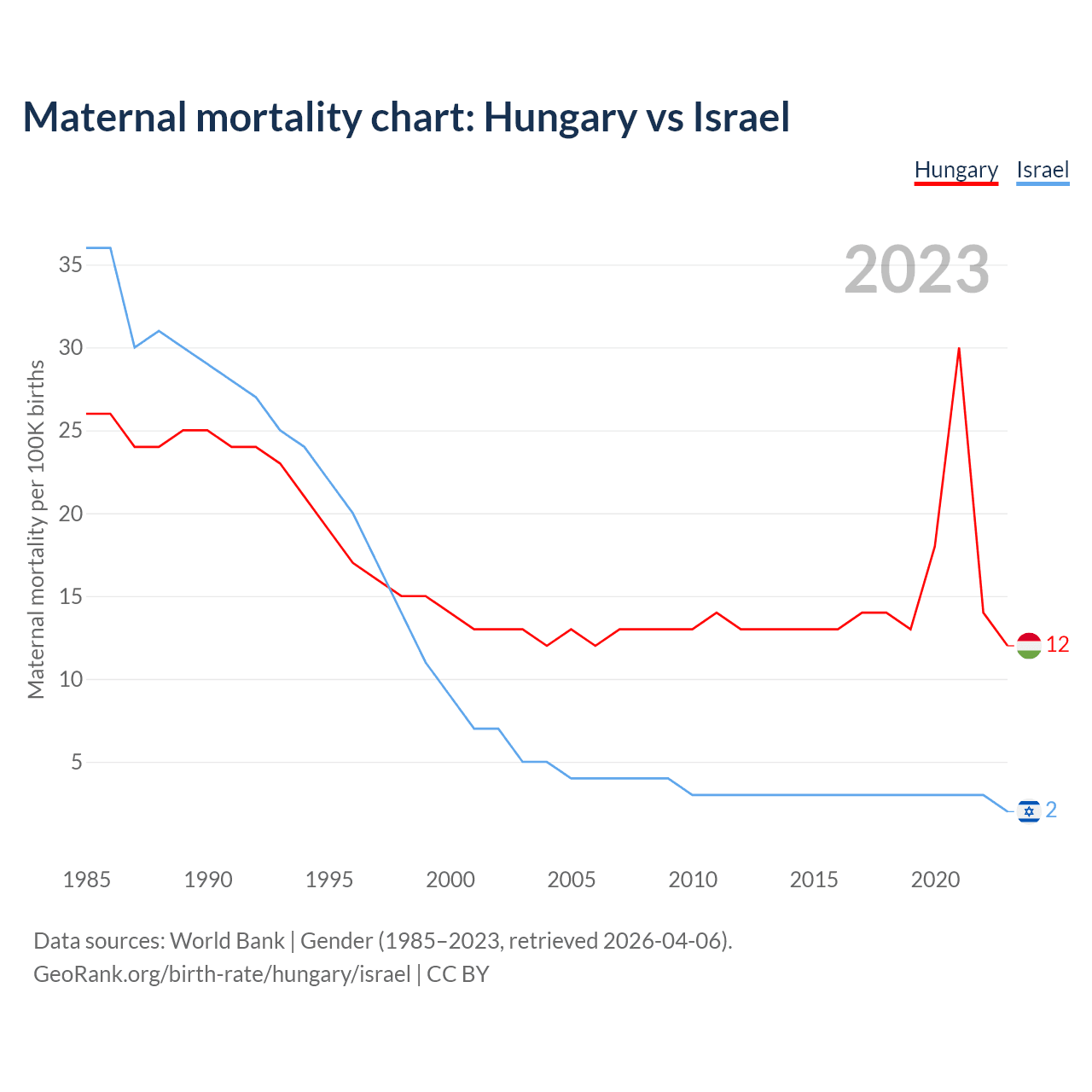 The maternal mortality rate, which is the probability of dying during childbirth or within 42 days of pregnancy termination, is 12 deaths per 100,000 live births in Hungary, compared to 2 deaths in Israel.