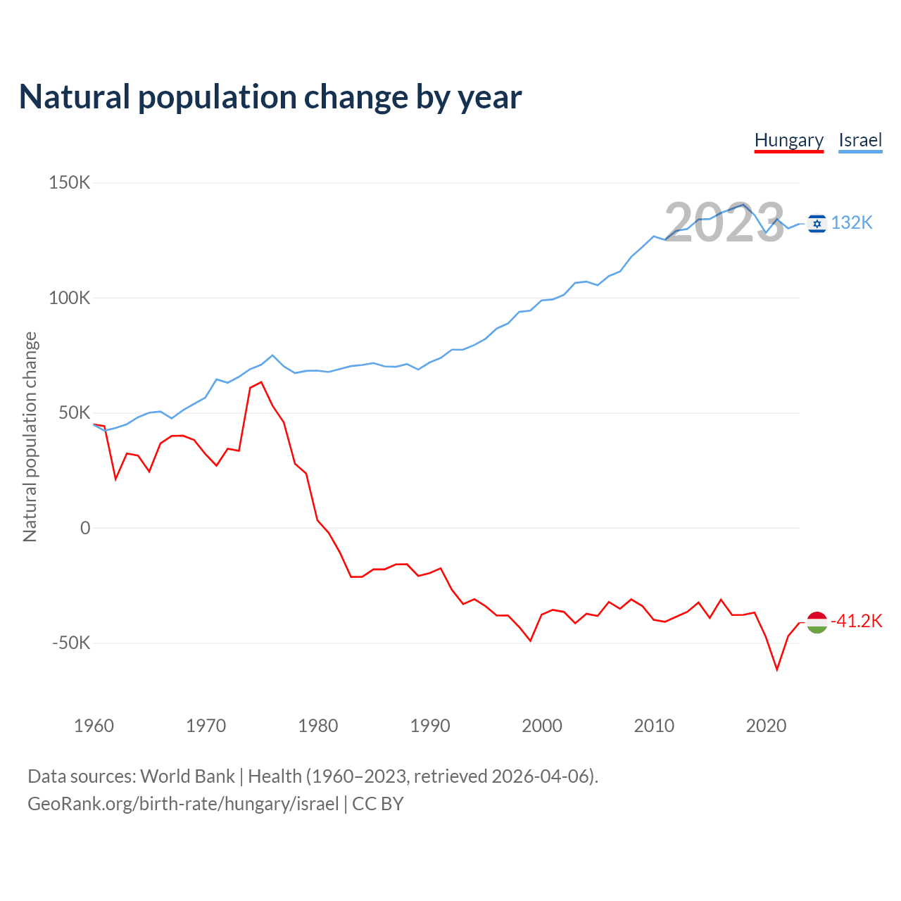 According to the latest available data on birth rates, the fertility rate in Hungary was 1.51 children per woman in 2023, compared to 2.85 in Israel in 2023. The replacement level is considered to be 2.1 children per woman.