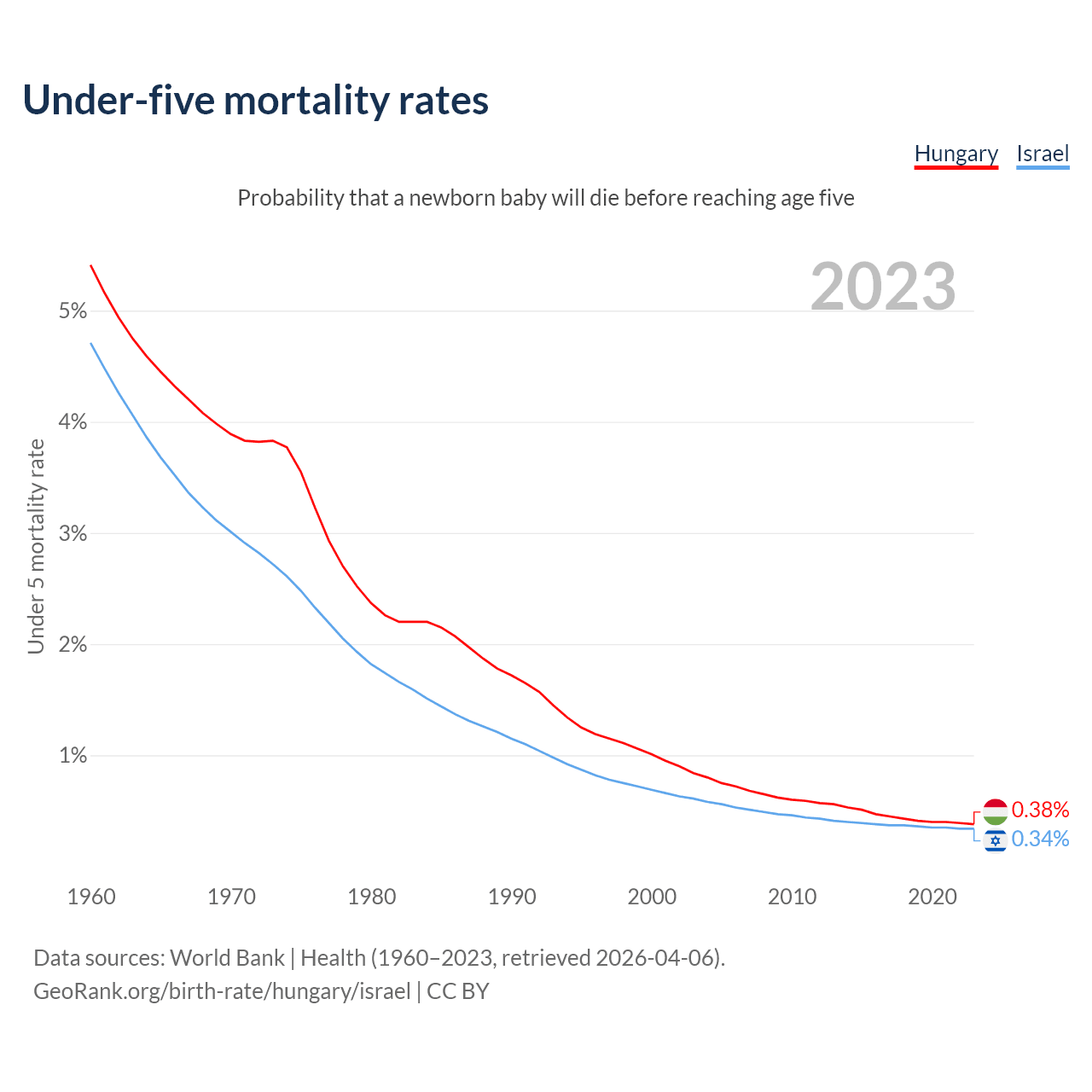 The chance that a newborn baby will die before reaching age five is 0.38% in Hungary and 0.34% in Israel. Above is a chart with historical data on under-five mortality rates.