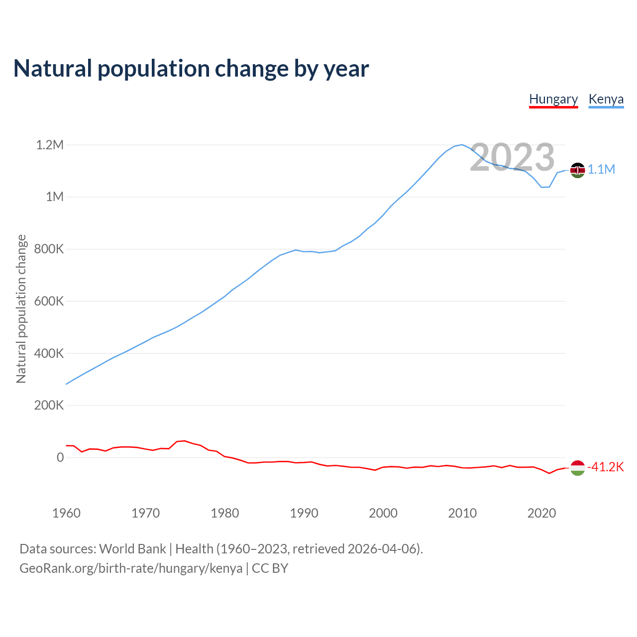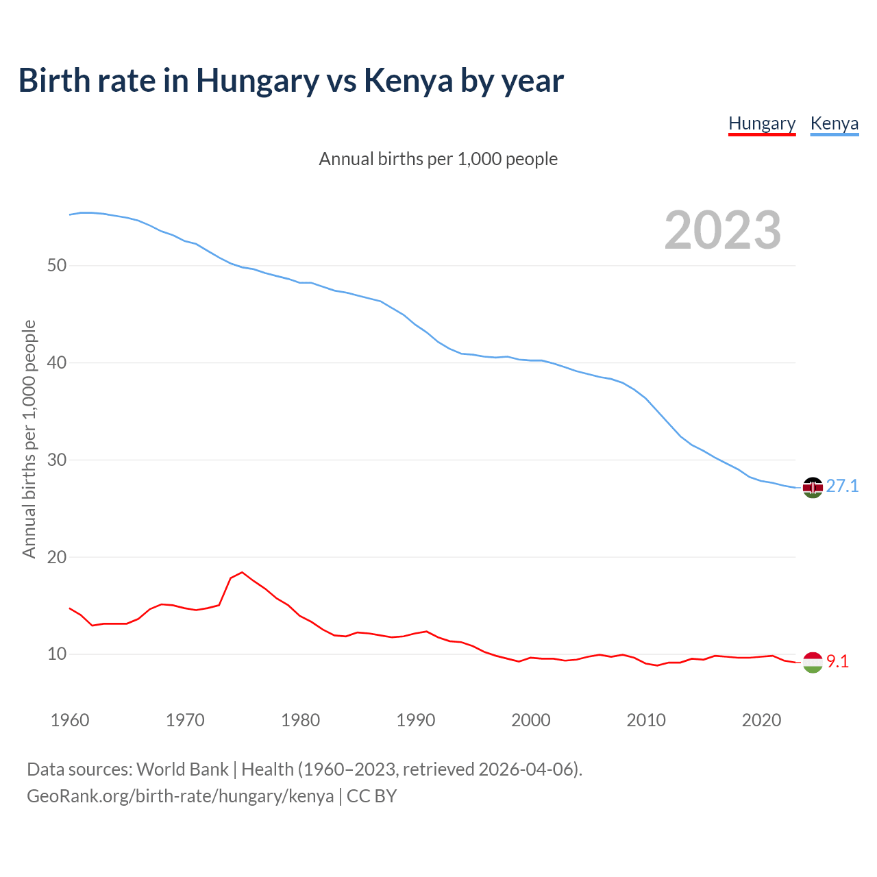 According to the latest available data on birth rates, the fertility rate in Hungary was 1.51 children per woman in 2023, compared to 3.21 in Kenya in 2023. The replacement level is considered to be 2.1 children per woman.