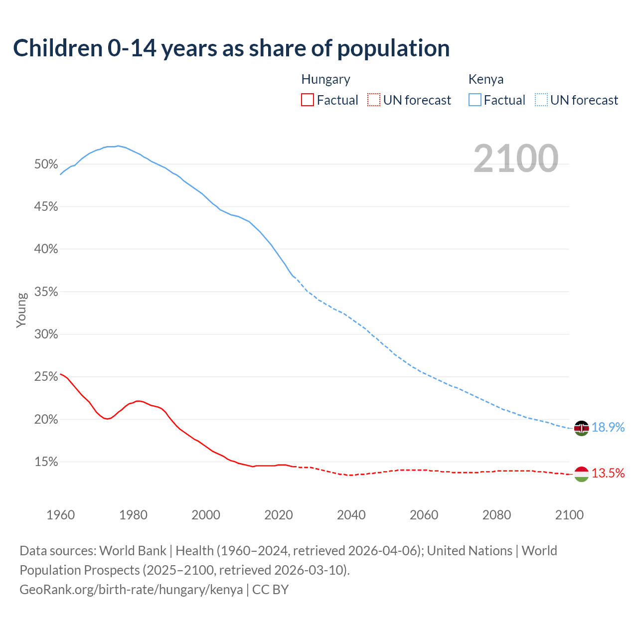 Hungary has an annual birth rate of 9.1 births per 1,000 people, compared to 27.1 for Kenya. The average number of children a woman is expected to have during her lifetime — the fertility rate, is 1.51 in Hungary and 3.21 in Kenya — 112.5% difference.