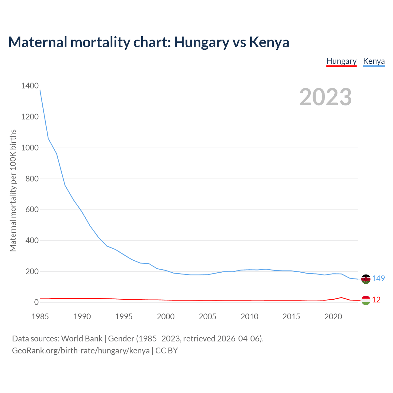 The maternal mortality rate, which is the probability of dying during childbirth or within 42 days of pregnancy termination, is 12 deaths per 100,000 live births in Hungary, compared to 149 deaths in Kenya.