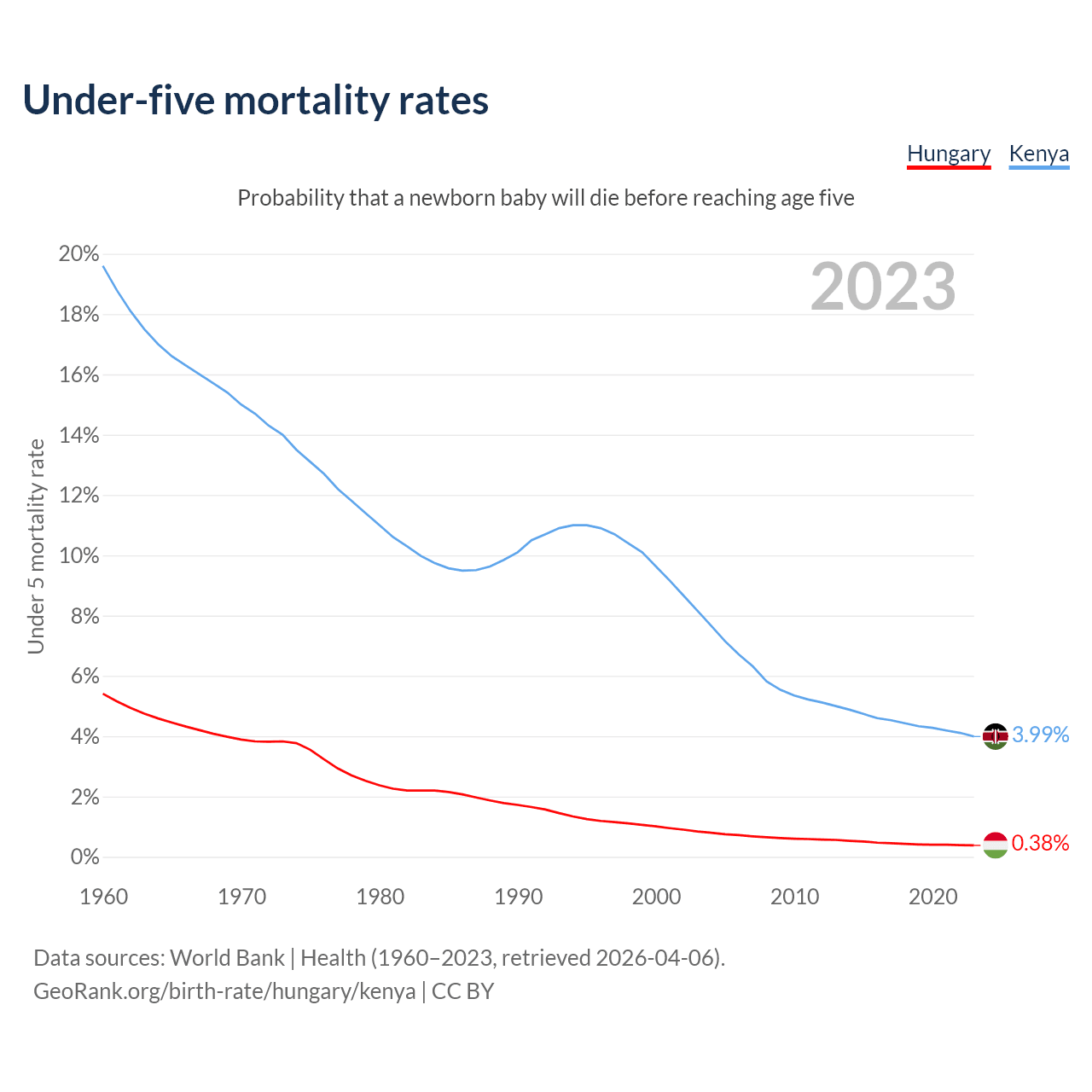 The chance that a newborn baby will die before reaching age five is 0.38% in Hungary and 3.99% in Kenya. Above is a chart with historical data on under-five mortality rates.